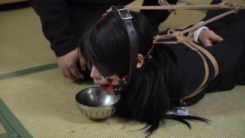 第三场景:海老缚后,胶带封嘴,肉丝套头,然后戴上全包头套,小0大喊受不了要停下来!