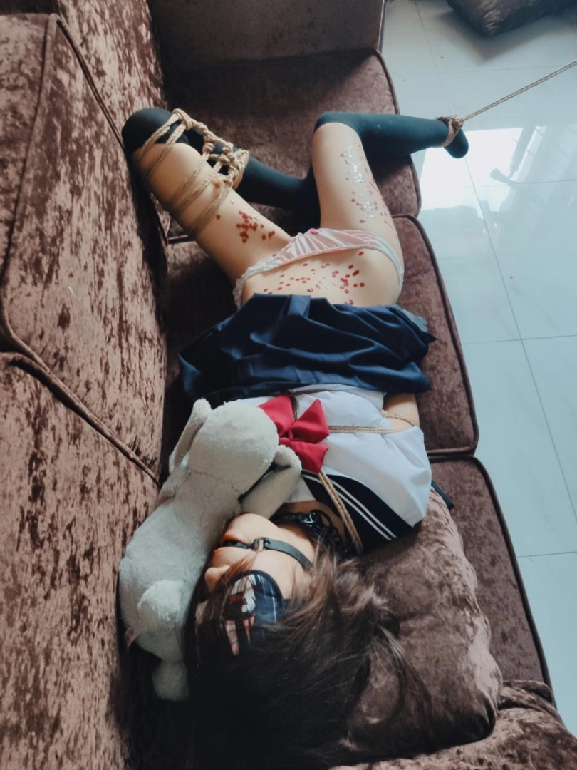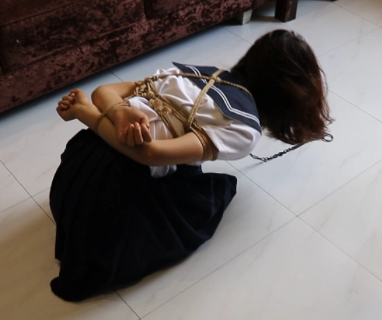 首先,给橘子绑日式后手缚之后让橘子下跪。然后把妹子一只腿折叠起来绑住,绑成折腿缚。另一只脚不绑。一只腿被折叠起来的妹子无法凭借自己的能力站起来,而另一方面另一只自由的腿又给少女一点点希望....这时候牵着橘子酱的项圈,强迫她以这种姿态爬行。。(看官们可以从膝盖磕在地面上的声音来了解爬动有多疼)妹子的腿超漂亮!!摇摇晃晃的爬行的样子特别特别可爱~