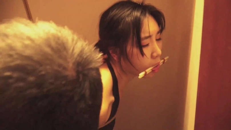 全身被严格的 捆绑着,伸出的 舌头被夹着,见到橱门打开,她抬眼看着阿东和王力。漂亮的 脸也 被这样拘束着,