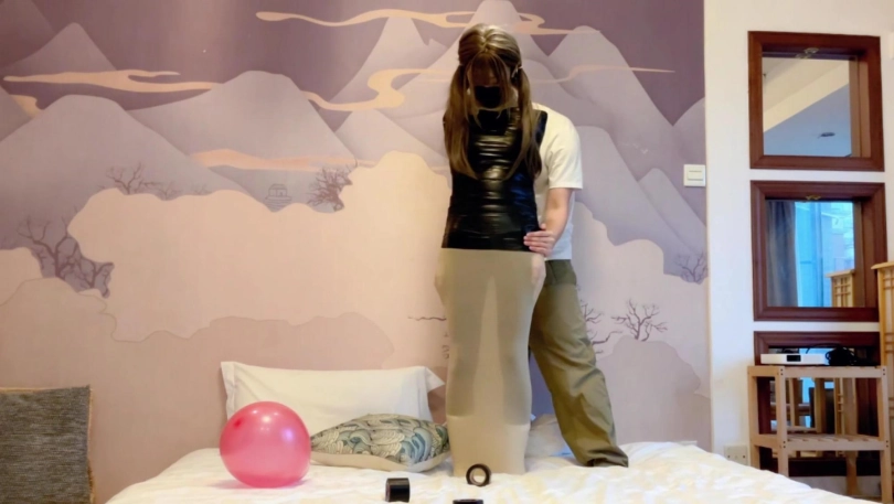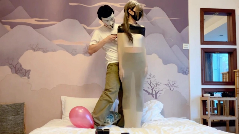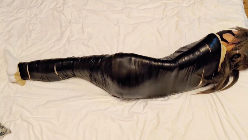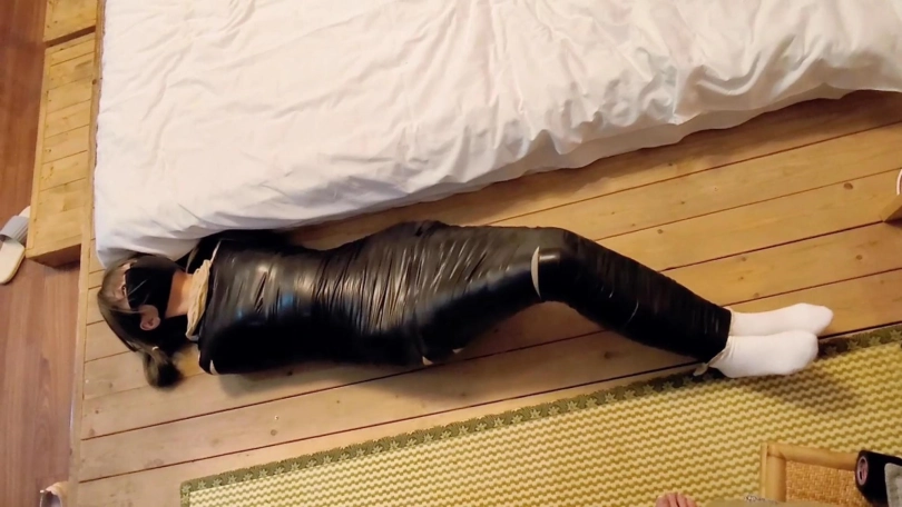 可爱的女孩子杉被黑色的胶带包成了木乃伊,子杉瘦瘦的身材在黑色胶带的包裹下活像只黑色的毛毛虫,为了完成我布置的几项任务,努力地在床上地面上艰难地蠕动着......