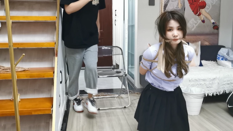 跪吊和桃缚两种绑法。优雅的小富婆娘婉瑜此刻穿着肉丝被麻绳紧紧绑缚,包裹着丝袜的美腿与圈圈绑紧的麻绳不断摩擦,樱桃小嘴被上次自己穿过的肉丝狠狠勒住,眼神哀怨楚楚可怜。婉瑜这次没有穿安全裤,肉丝裆时不时走光,羞耻万分。
