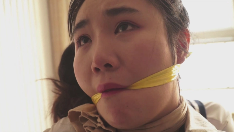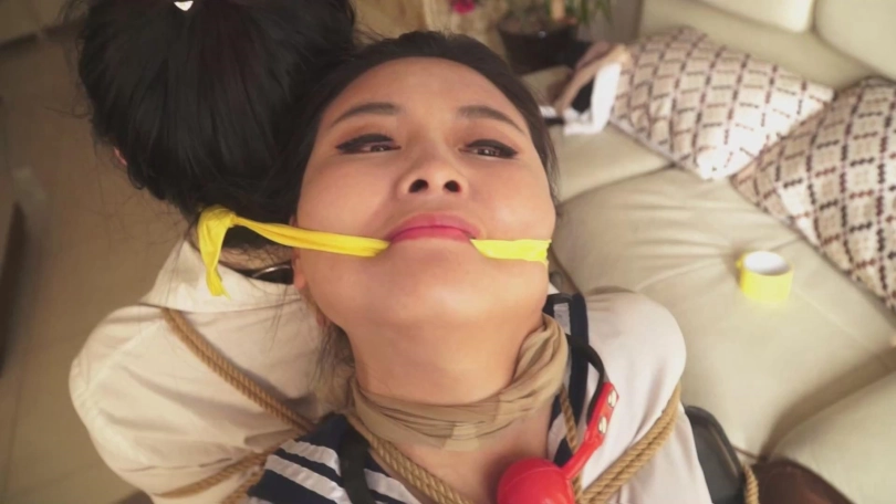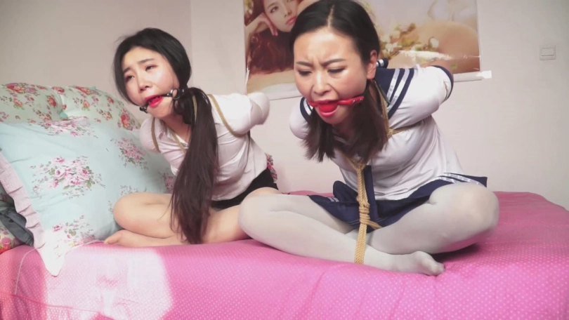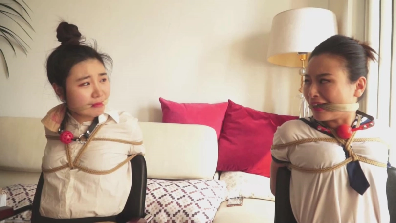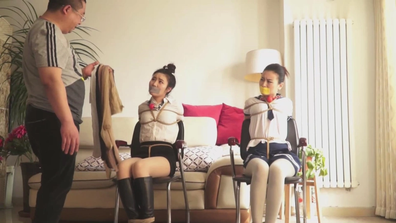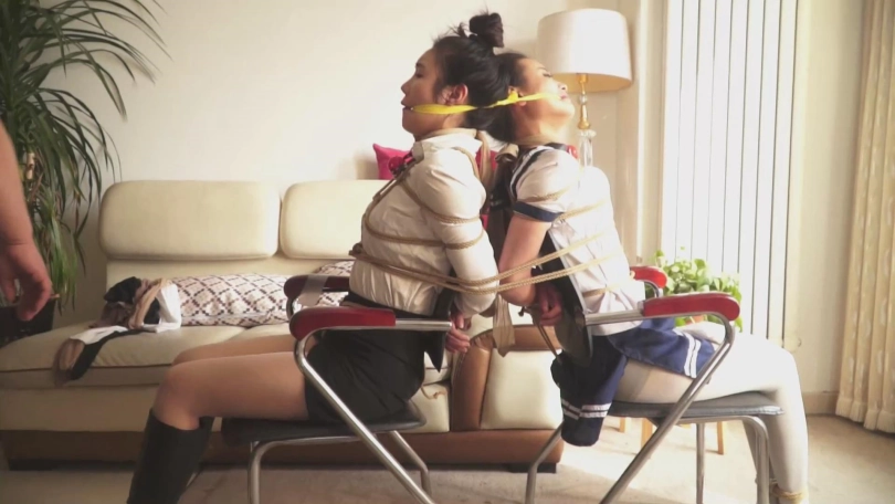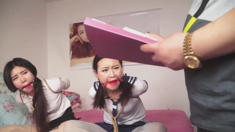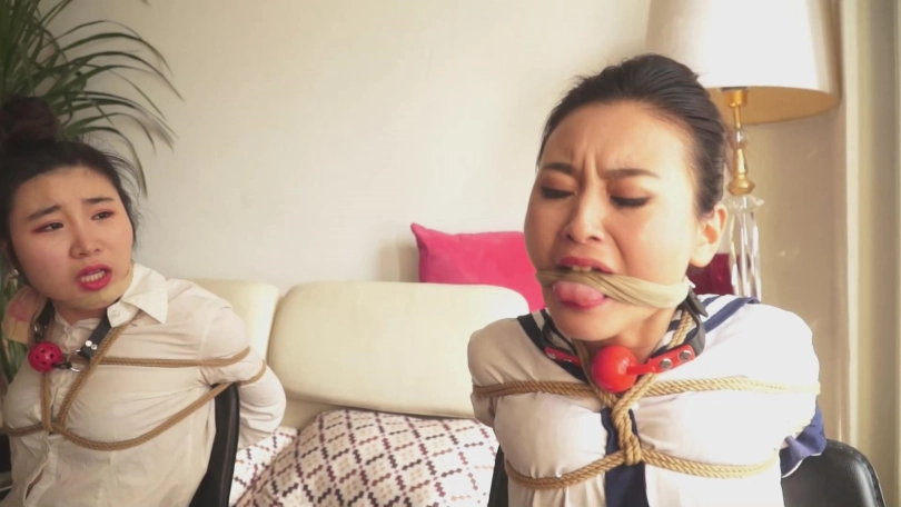 故事承接中集。女教师文慧和女学生施若被张权一起捆绑,各种堵嘴。两人想要逃离,刚刚用舌头抵住了勒嘴的丝袜,想要呼救,无奈张权立刻赶到,塞紧两人的小嘴。接着张权将二人背靠背捆绑,又用一张胶带勒住两人的嘴巴,两人非常痛苦。最后,她们被张权用耻辱的海老缚绑在床上。口球塞嘴,口水横流。张权又拿出了素描本,描绘两人被捆绑的样貌。最终,两人被蒙上双眼,丝袜套头,静静地等待张权无止境地玩弄……