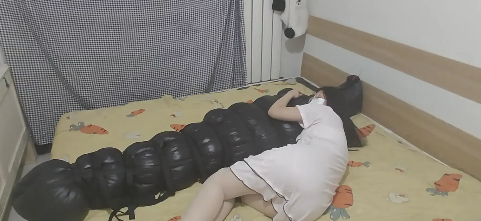不知道学姐从哪里淘来的羽绒睡袋,把小学弟装进去看看,哇~好舒服呀,软软的,正好可以当抱枕~有没有想当学姐抱枕的宝宝们~
