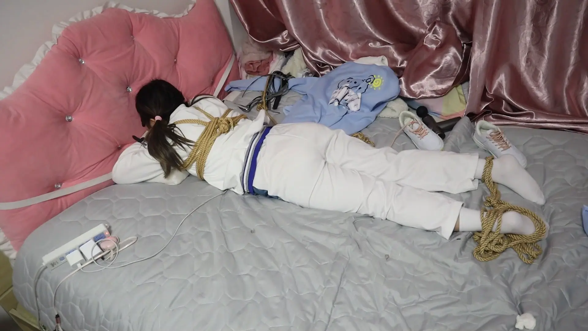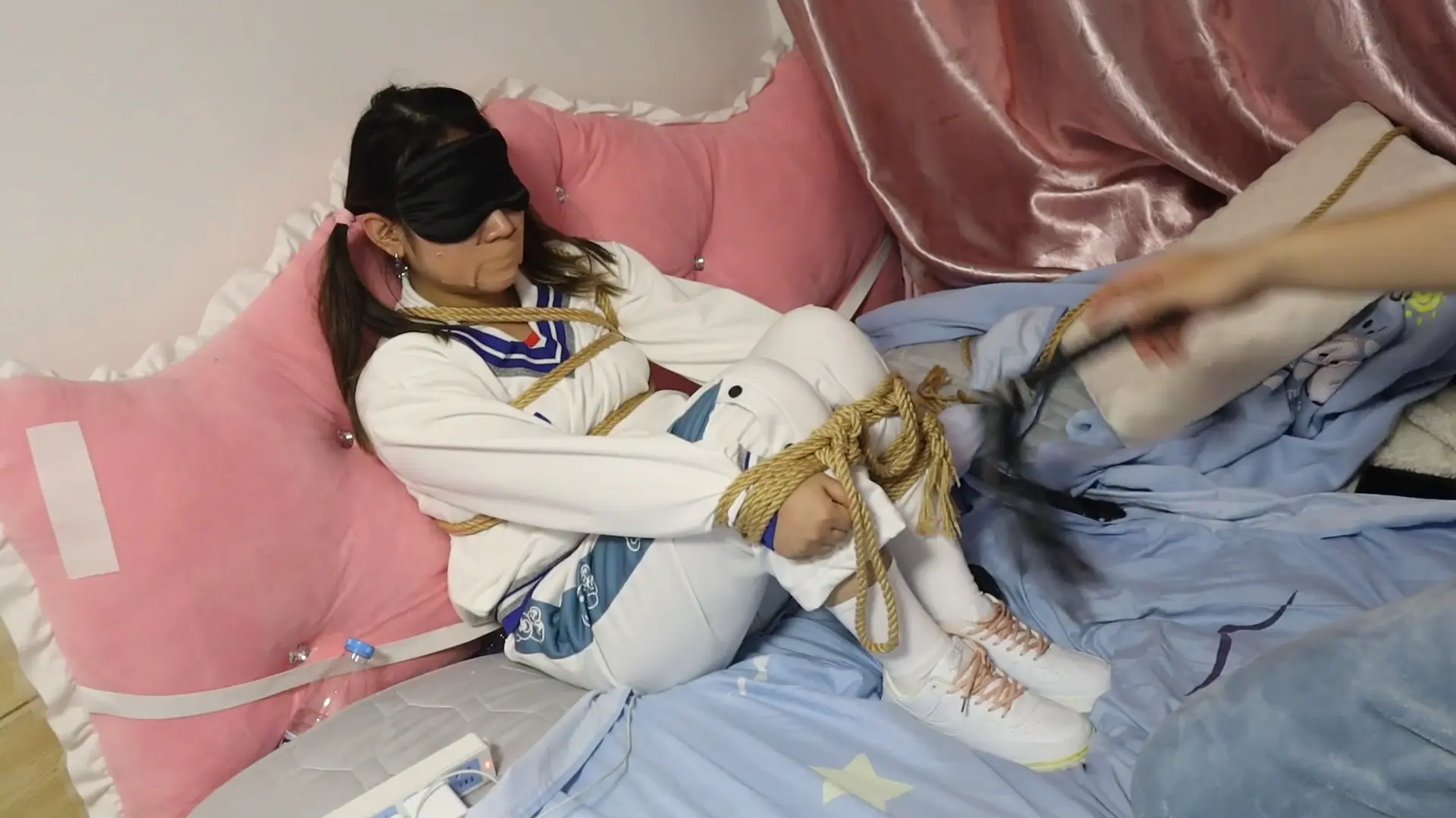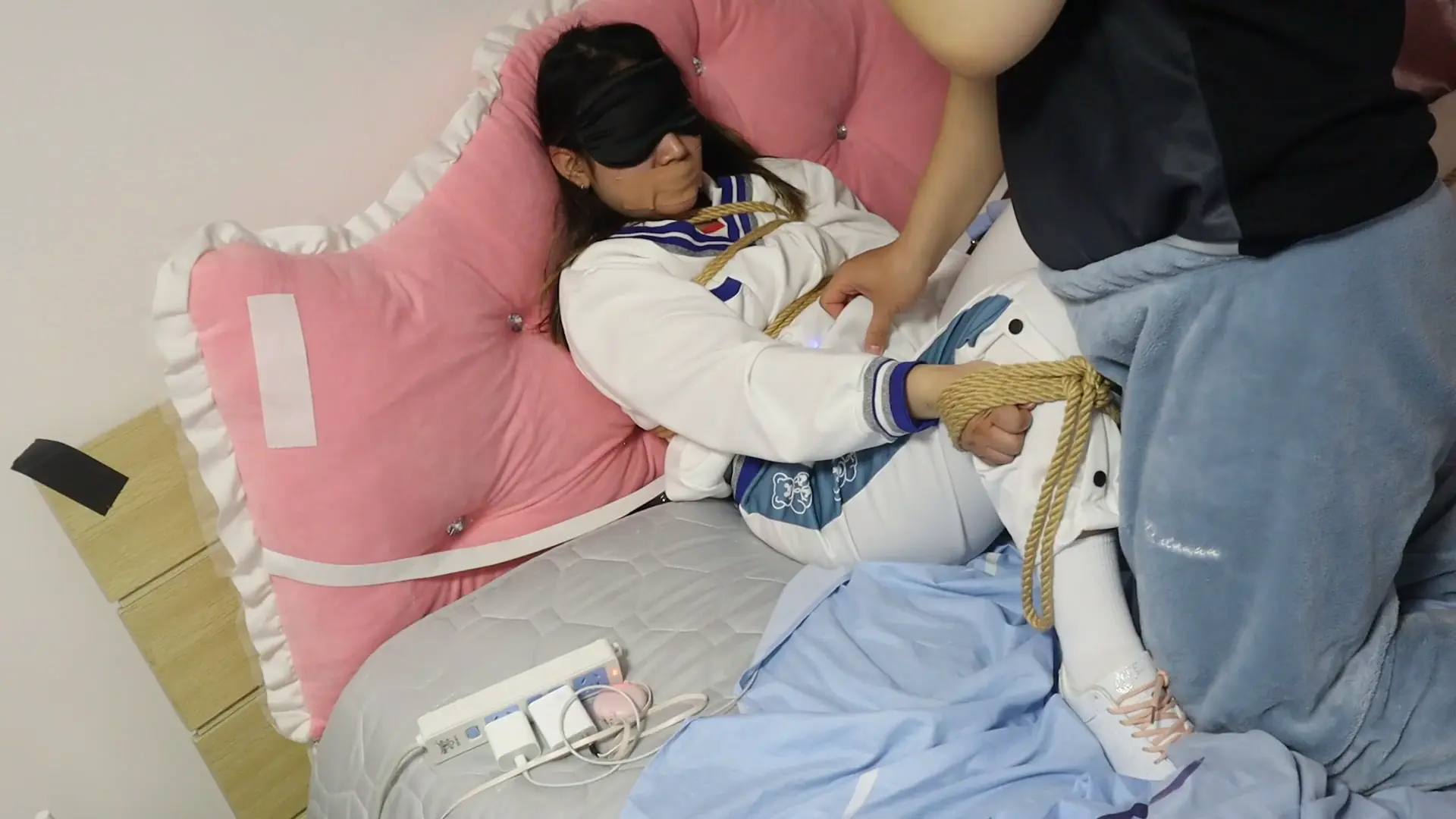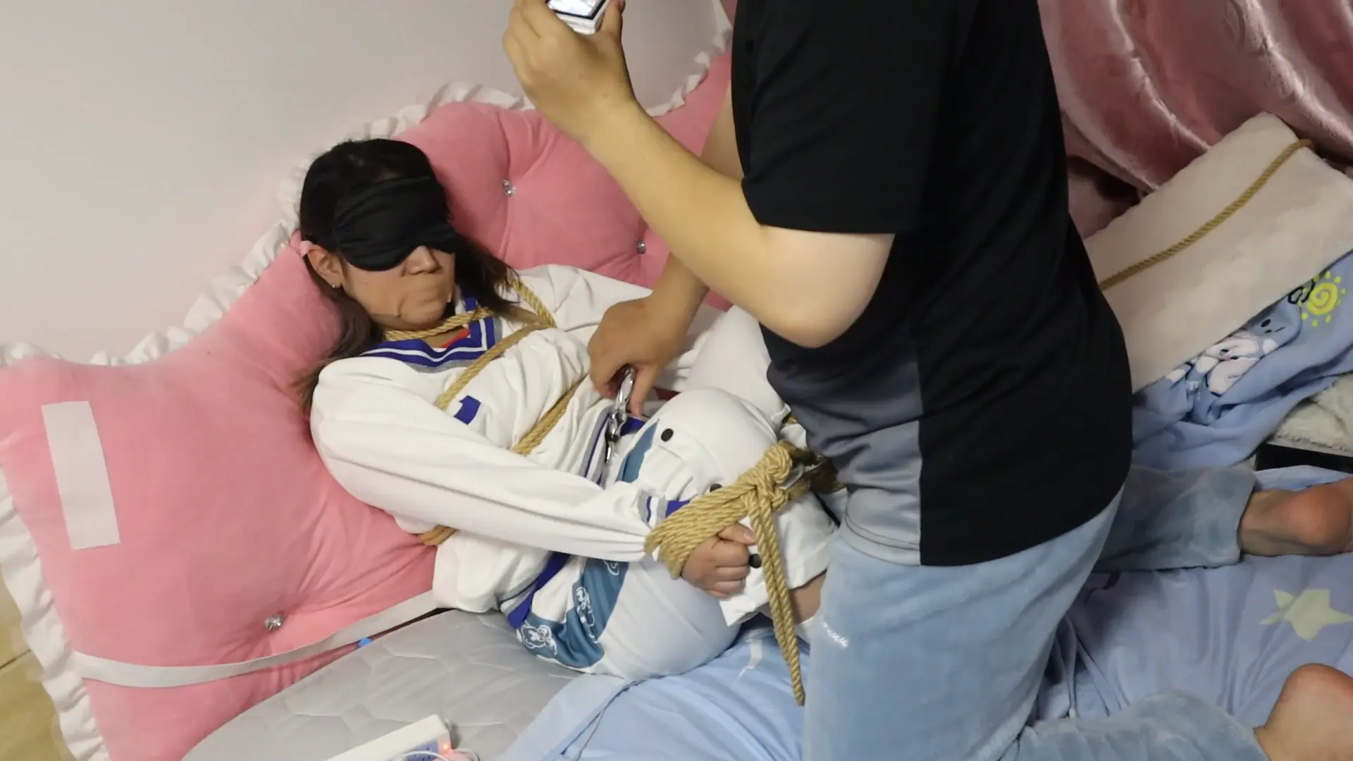 M开腿缚的甜美女孩VV,刚一上震就开始尖叫,一边被电的吱哇乱叫,一边拼命挣扎 一边被玩一边被呜咽,呜呜呜的惨叫被胶带封住嘴,把手指放到少女的嘴里用口舌吮吸一下就乖乖安静下来啦VIVII拼命吮吸向主人示好 安静下来就继续搞你咯 呜呜呜不要 少见穿着裤子被玩弄的vivi