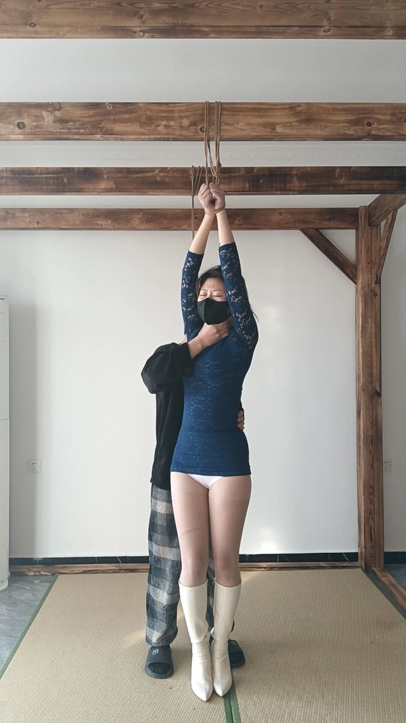 珺珺身着蓝色少妇战袍被双手吊起来,无法动弹,胸部被使劲的揉捏,感觉胸部快要被捏烂了,绑匪折磨完还是不解气,于是掐起他的脖子把他高高举起,最终珺珺窒x而死,匪徒于是决定奸shi.