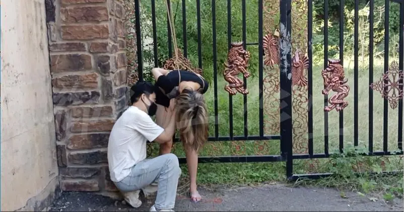 可怜的君君就这样被吊在了大门上,变态的追求者还把乳夹夹在了君君粉嫩的小樱桃上,君君想要呼救却怕自己羞耻的样子被路人看到,自能任由这个变态折磨,自己找机会逃走,脚上的脚铐让每一步路都极其难走,乳夹和脚趾被相连在一起,君君只能被迫弯着腰走路,可恶的变态还不断用胯下的股绳紧紧的勒着神秘的峡谷,君君最终。