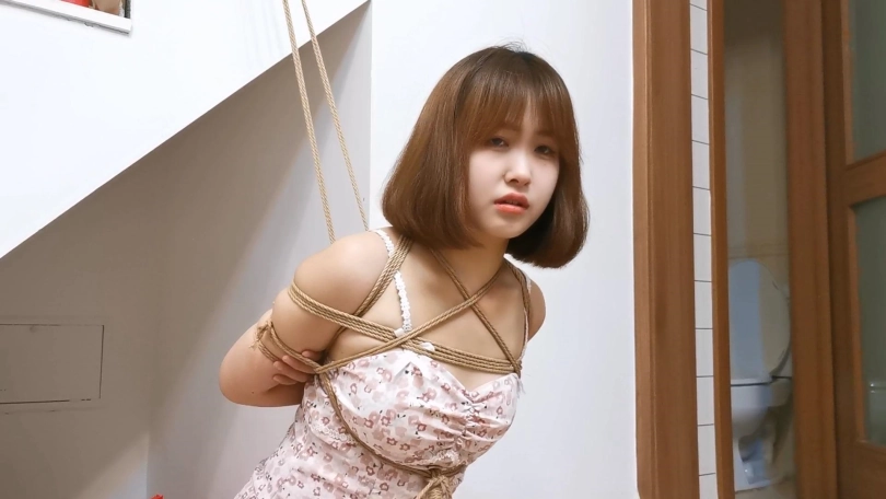 新模特玥妍,一个超级可爱的小罗利,皮肤白的发光,肉肉的可爱的就像洋娃娃一样,而且模特性格特别好,被紧紧的绑着还笑得出来。把玥妍日式紧缚起来,绳子都吃到肉里去了,跪绑在楼梯下,身前有绳子牵引无法直起身子,再戴上口球,看她在那一个人挣扎,就像是看漫画里的人物一样。