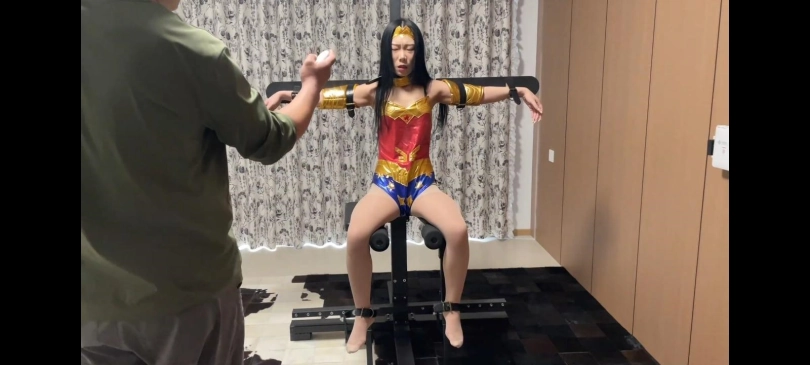 神奇女侠来到罪犯家中追捕他,结果被坏蛋从监控中发现了开启机关,女侠走到墙附近突然被吸到墙上,身体动不了,坏蛋走出来开始嘚瑟,女侠尝试的动几下,然后开启神力挣脱机关。坏蛋吓坏了,女侠摆好姿势准备将他打倒,这时罪犯拿出定身器,把女侠定住如下图。女侠无法动弹,恶狠狠的看着他并让他解开她。罪犯:我看你怎么用超能力。便开始摆弄姿势,让她撅起屁股保持这个姿势脱下她的靴子露出脚丫挠她脚心,女侠哈哈大笑,别挠了,好痒啊。坏蛋听完更兴奋了。折磨两分钟给女侠绑在架子上(脖子和脑袋也固定在架子上),解开定身坏蛋开始挠她脚心,女侠全身颤抖,拿出电击棒电她,女侠演出被电的感觉,电她的腿,胳膊等部位,功率提高到最大怼住脚丫不松开,女侠虽然被定住,身体不由得抽搐,被电的翻白眼晕了过去。
