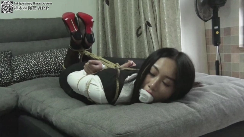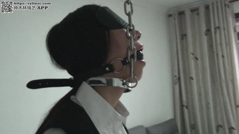 细高跟黑丝美女被铁链拴住脖子挂在吊钩上,口球塞嘴,脚镣束缚囚禁,后又被驷马捆在沙发上,毛巾塞嘴,脱鞋挠脚心