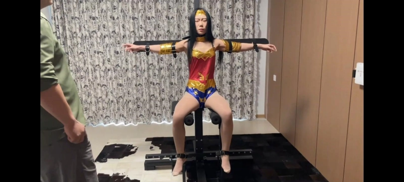 女侠来到罪犯家中追捕他,结果被坏蛋从监控中发现了开启机关,女侠走到墙附近突然被吸到墙上,身体动不了,坏蛋走出来开始嘚瑟,女侠尝试的动几下,然后开启神力挣脱机关。坏蛋吓坏了,女侠摆好姿势准备将他打倒,这时罪犯拿出定身器,把女侠定住如下图。女侠无法动弹,恶狠狠的看着他并让他解开她。罪犯:我看你怎么用超能力。便开始摆弄姿势,让她撅起屁股保持这个姿势脱下她的靴子露出脚丫挠她脚心,女侠哈哈大笑,别挠了,好痒啊。坏蛋听完更兴奋了。折磨两分钟给女侠绑在架子上,解开定身坏蛋开始挠她脚心,女侠全身颤抖,拿出电击棒电她,女侠演出被电的感觉,电她的腿,胳膊等部位,功率提高到最大怼住脚丫不松开,女侠虽然被定住,身体不由得抽搐,被电的翻白眼晕了过去。女侠的手绑到椅子两边把手上,多捆几道,中间股绳,椅子可以放电,冰冻,还能放出针扎人,坏蛋开启电击模式。女侠被电的抽搐,坏蛋给关上:不想受折磨就得听话,叫主人,女侠不叫。把电流慢慢开大,女侠受不了只能叫:主人。说我是你的女奴,主人不要惩罚我了,女侠不情愿的说。坏蛋可不会放过她,马上开到零下几十度,极寒状态下女侠瞬间被冻成了冰雕,全身冻僵但还有意识坏蛋掰她的手指头,冻僵的女侠感受到疼痛,表情痛苦的看着他,发出微弱的叫声。拿来锤子敲她的腿,女侠很疼演出难受的感觉,坏蛋便把温度调正常,女侠慢慢恢复了。拿来鞭子抽她,女侠疼的龇牙咧嘴,不过瘾又拿来电击棒,电击她各个部位,女侠叫声太大,坏蛋塞入一整条原味丝袜慢慢塞满戴上口球把她头仰起来用胶带固定到椅子上。女侠只能发出呜呜的声音,还有针灸模式呢,开启了针灸模式底部和背部会放出小针扎她,女侠疼得要命扭动着身体,坏蛋用定身器定住她,女侠只能忍受,呜呜的叫唤很难受。解开她女侠剧烈的扭动着身体,又定上,玩够了关上了针灸模式,开始挠女侠的脚心,用各种道具挠有的都可以用,女侠呜呜的叫着,可以穿插定身,女侠哈哈大笑,用电击棒电她,一直加大电击棒的电流,摁住不撒手女侠叫的越来越大声,然后三种模式一起开,女侠折磨的死去活来全身剧烈抽搐,慢慢不动昏死过去。然后坏蛋把她犬缚绑了起来身上龟甲缚加股绳。这里换衣服体操服肉丝脖子戴上电击项圈,戴上链子牵着她爬几圈,打开电击项圈,女侠被电的颤抖的爬,很好不错,嘴里塞上丝袜戴上马具口塞。鼻钩戴上可以松一点,又开始一轮折磨电击鞭打加疯狂挠脚心,腋下各种折磨。自由发挥电击挠脚心穿插定住折磨,解开折磨。折磨十多分钟左右,女侠慢慢坚持不住摊在地上,坏蛋也玩累了,定住她侧躺放置。把她嘴里丝袜和口塞鼻钩都拿下来,女侠活动下嘴嘴里大骂坏蛋,模特可以发泄着骂几句自由发挥,坏蛋拿来臭丝袜先闻下,唉真臭然后袜尖最臭的地方放在鼻子上用胶带固定,一呼吸就能闻到这酸爽的臭味,女侠熏的直恶心用干净的就行,嘴上喊着:好臭不要啊,趁着嘴巴张开,罪犯拿上臭丝袜就塞进她嘴里塞满,女侠呜呜叫唤。头上套上黑色丝袜,用红色胶带在嘴部丝袜外面缠几圈,把女侠眼睛定住不闭眼,女侠的眼睛在丝袜里惊恐的转动特写十几秒。然后戴上红色眼罩和头套,把女侠手握成拳头用粉色胶带包起来,脚也用胶带包起来。然后开启了电击项圈,女侠浑身抽搐挣扎,非常可怜,看你这么痛苦,给你喷上石化喷雾女侠变成一座石像,罪犯无论怎么挠痒 电击 鞭打都动不了。但是能感受到痛苦。然后把一些拘束道具放到她脚心和背上。神奇母狗雕像制作完成,以后让我放点道具也不错。只留女侠在这儿给个一分钟左右特写,女侠无意识。