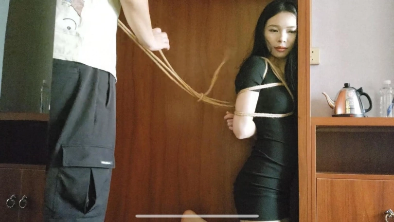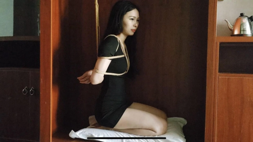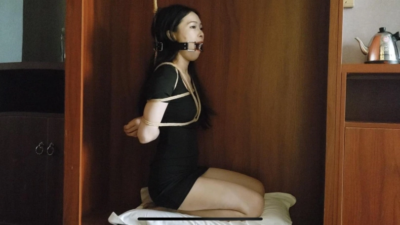 绳命线原创,柜子里的女孩,蓝羽日式绑上后,让她跪在柜子里,把脚和手都吊在了柜子里的晾衣杆上,戴上口枷口水哇哇流个不停,特别是挠痒之后流得更多了挺带感的。