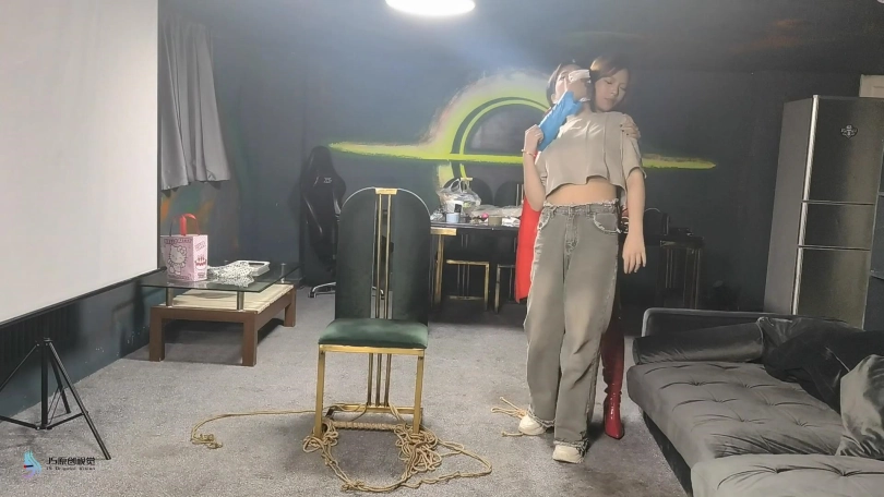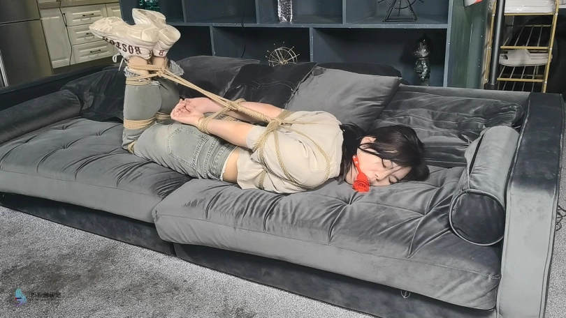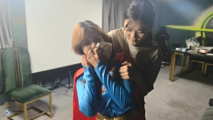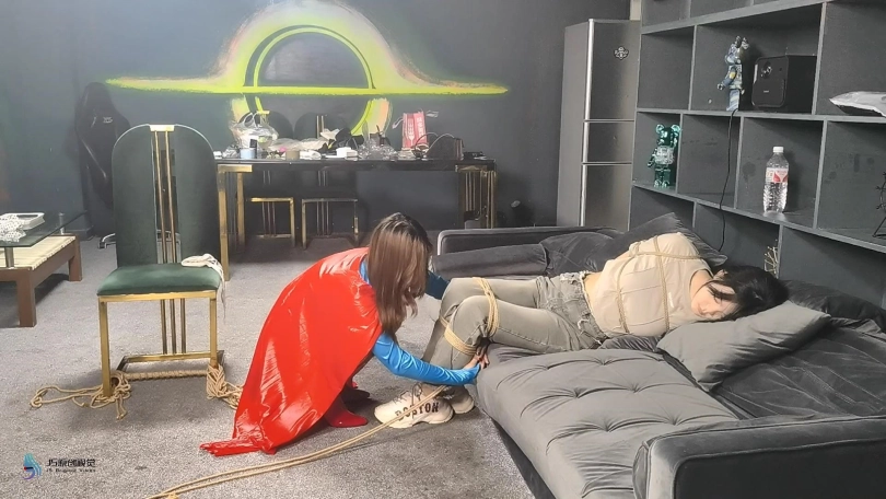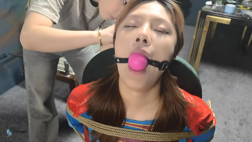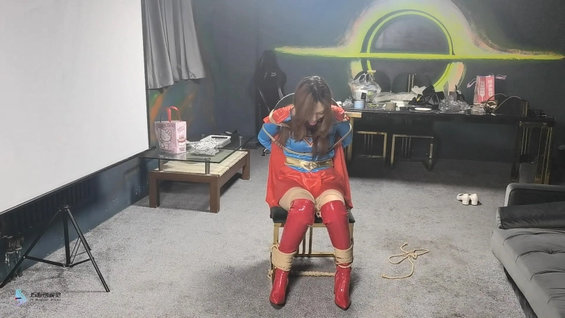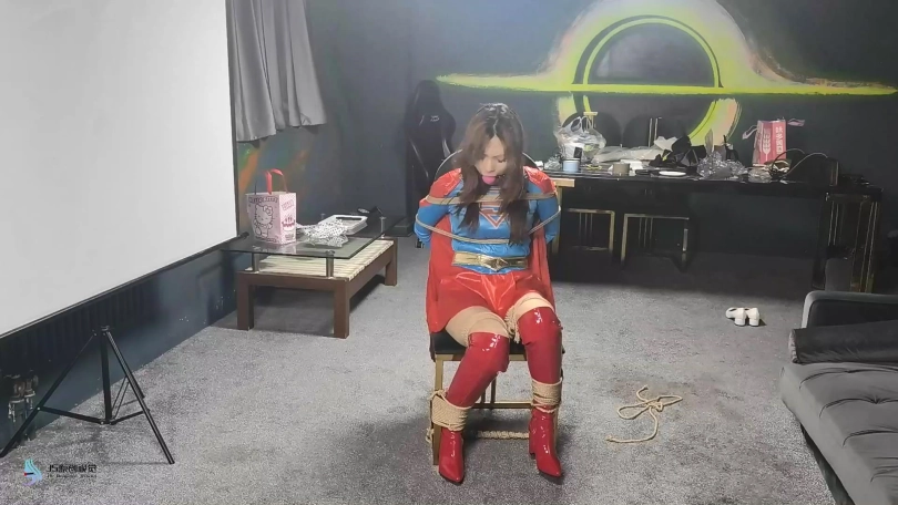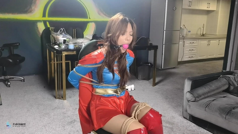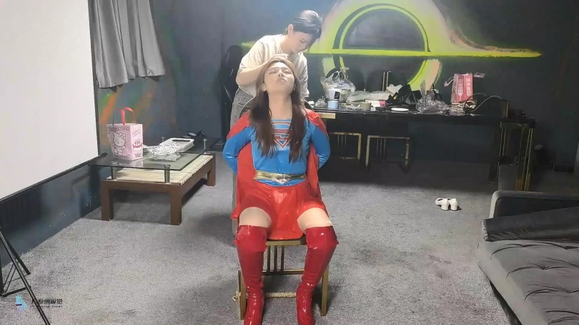 女人贩子将女超人捆绑在椅子上,用口球塞住了她的嘴后离去。当女超然醒来发现被绑,不断的在椅子上挣扎,最终挣脱了束缚,拿起药水布藏了起来。当女然贩子回来发现椅子上不见的女超人感到奇怪时。女超人从后面用药水布捂住了女人贩子的口鼻。这下轮到对方在女超人的怀里无力的等着双脚挣扎了,很快就会了过去。女超人拿起绳子将女人贩子驷马捆绑起来,用一个玫瑰花口球塞进她的嘴里。醒来的女人贩子无力的挣扎着,等待她的将是正义的制裁。