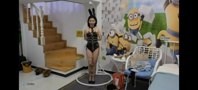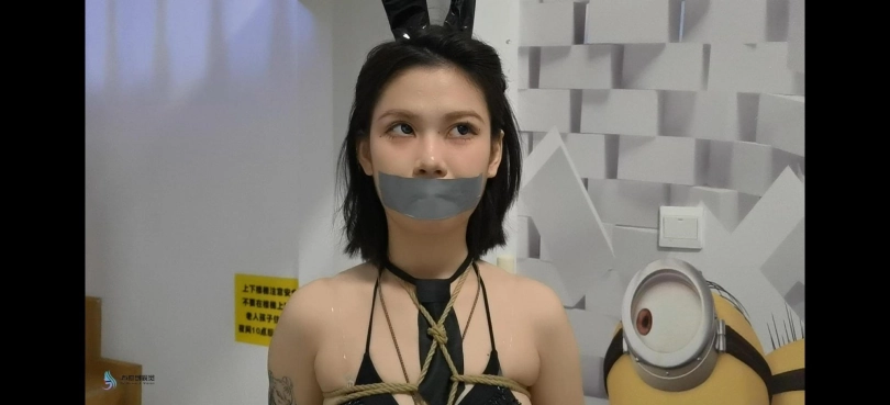 小美女夏瑾身穿兔女郎套装渔网袜和黑色高跟鞋,性感又不失青春靓丽,还有很体现个性的唇钉,站立龟甲缚并腿缚后滴入柠檬汁后金属马具口球堵嘴流口水,还有透明胶带和银色胶带封嘴,最后柠檬和白色口球口水不断的流出,模特也非常可爱,可惜模特现已退圈