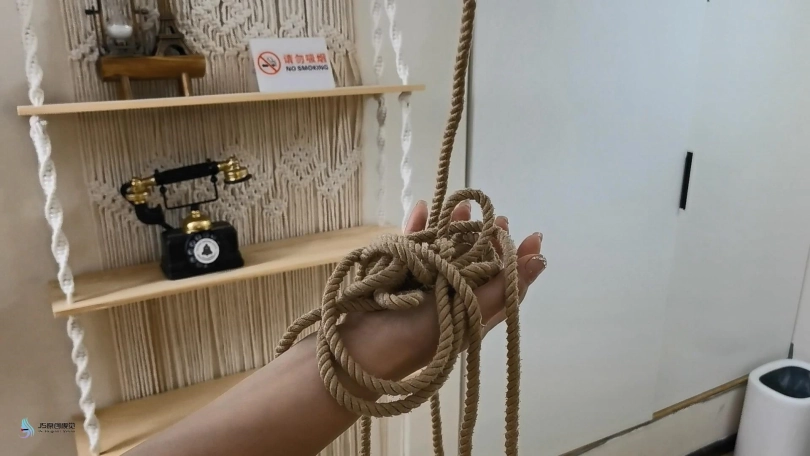 镜头一转,B反而被A的捆仙绳绑住了,双手反绑,双腿双脚没被绑住可以动。A把B扶起来,鸭子坐在床上。