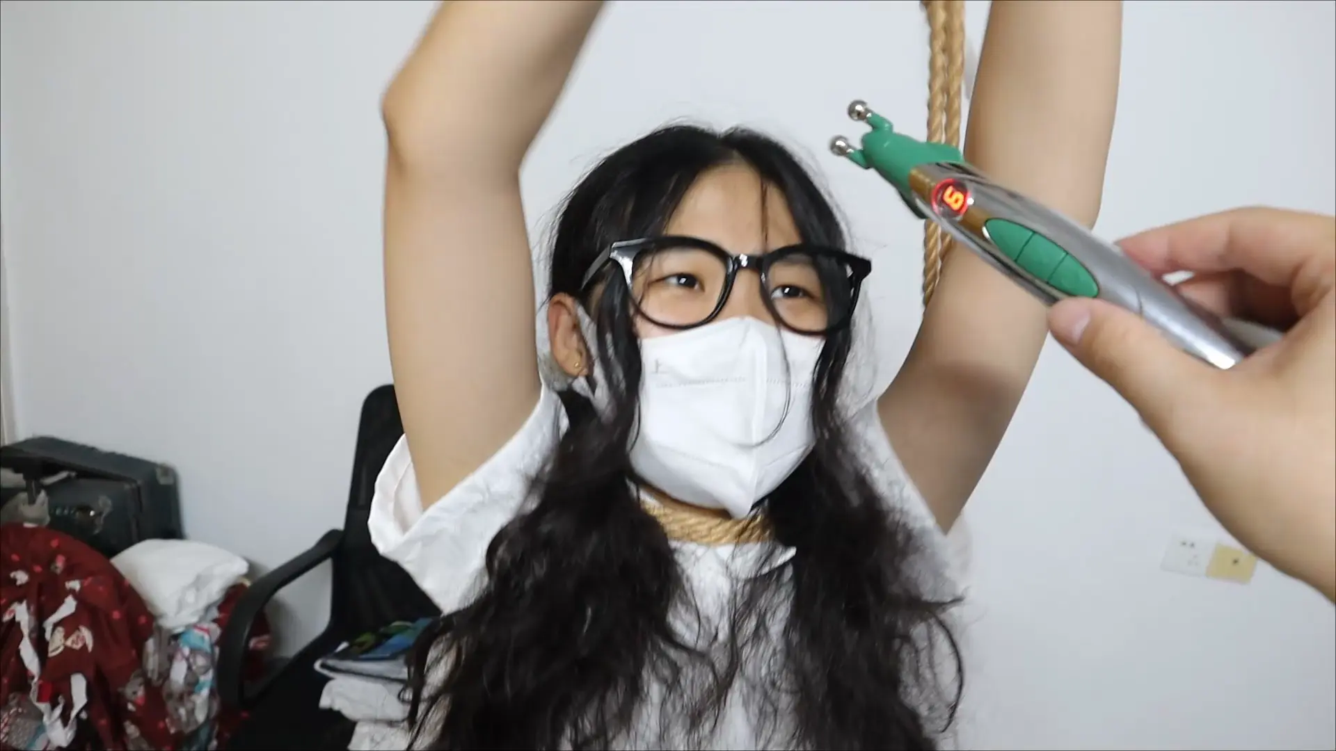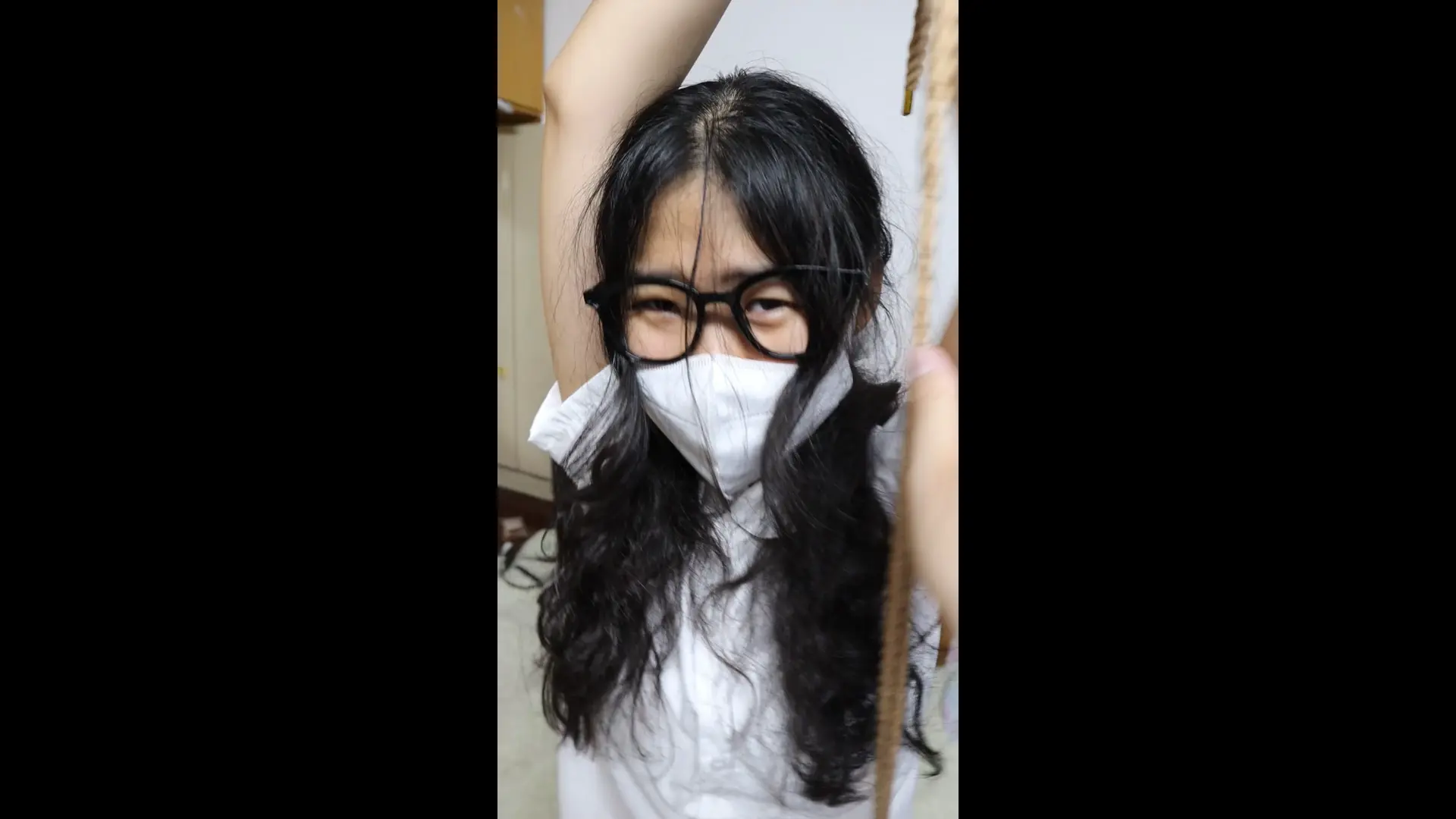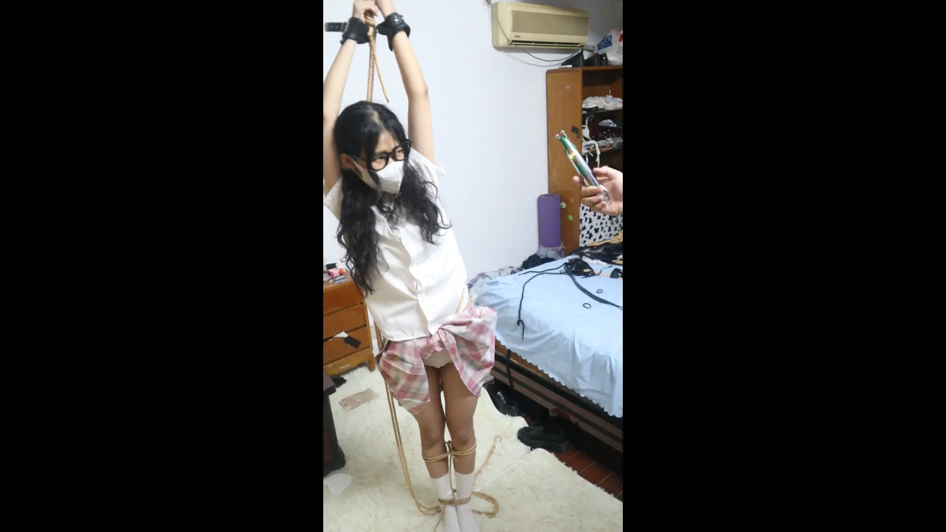 【荷仙少女】【优异眼镜少女兼职的噩梦】虞琳是一名想兼职模特的高挑女学生,来到拍摄房间里,脱下牛仔裤,换上可爱衣服裙子后刚拍动作就被坏人叔叔迷晕,醒来后发现自己被双手吊着绑了起来,这发现对方是调教女