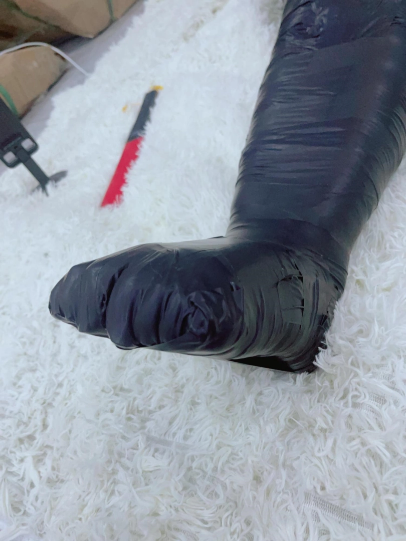 另外一个看点就是脚底。我在包裹脚底的时候特意问了模特要紧一点还是松一点,妹子决定紧一点。于是我选择了把脚趾脚底都绷紧的包法——隔着胶带依然能看到清晰的脚趾绷紧的纹路,完全失去站起来移动的可能。