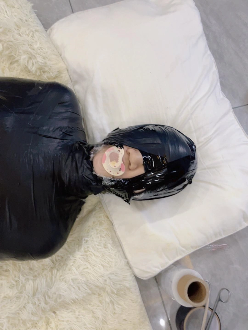 内容:作为上半部分,首先展示的是完整的全包过程。用保鲜膜打底后,贴上胶带。值得一提的是模特口中还带了奶嘴口塞,然后用保鲜膜和胶带封住头部。我选择了更复杂的胶带封头而不是头套,希望解开的困难可以给模特带来更严厉的心理体验。