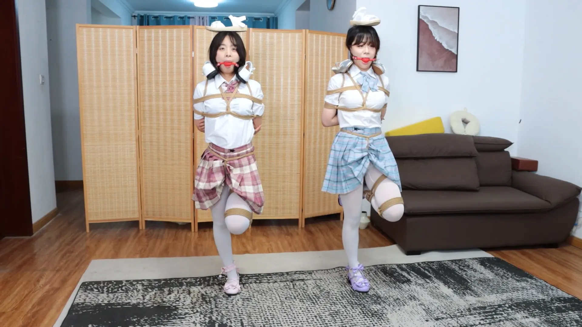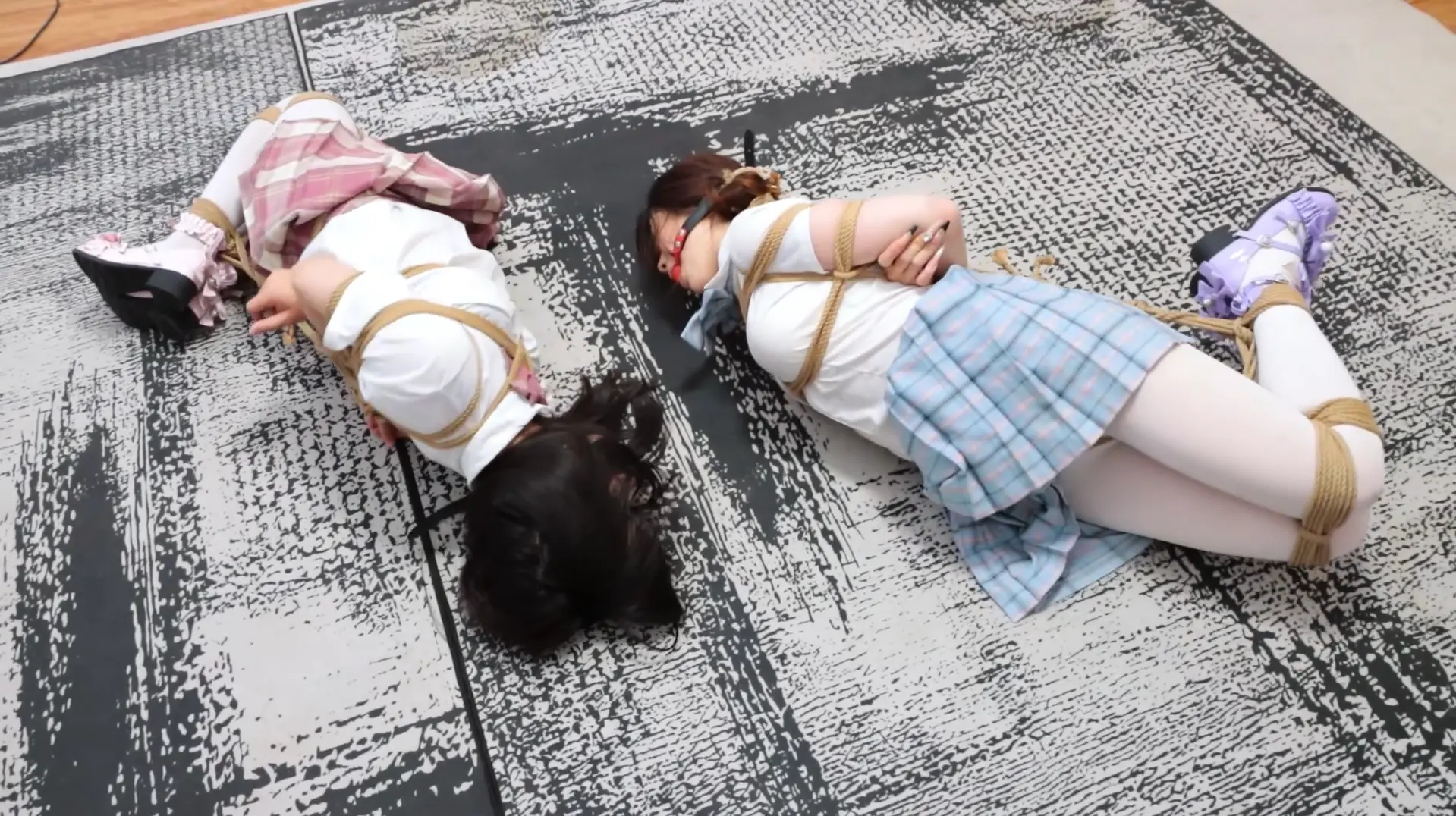 捆绑方式:在第五项捆绑的基础上,解开两人脚掌上的绳子,然后将两人连接手脚绑成驷马,取下蒙眼的胶带。