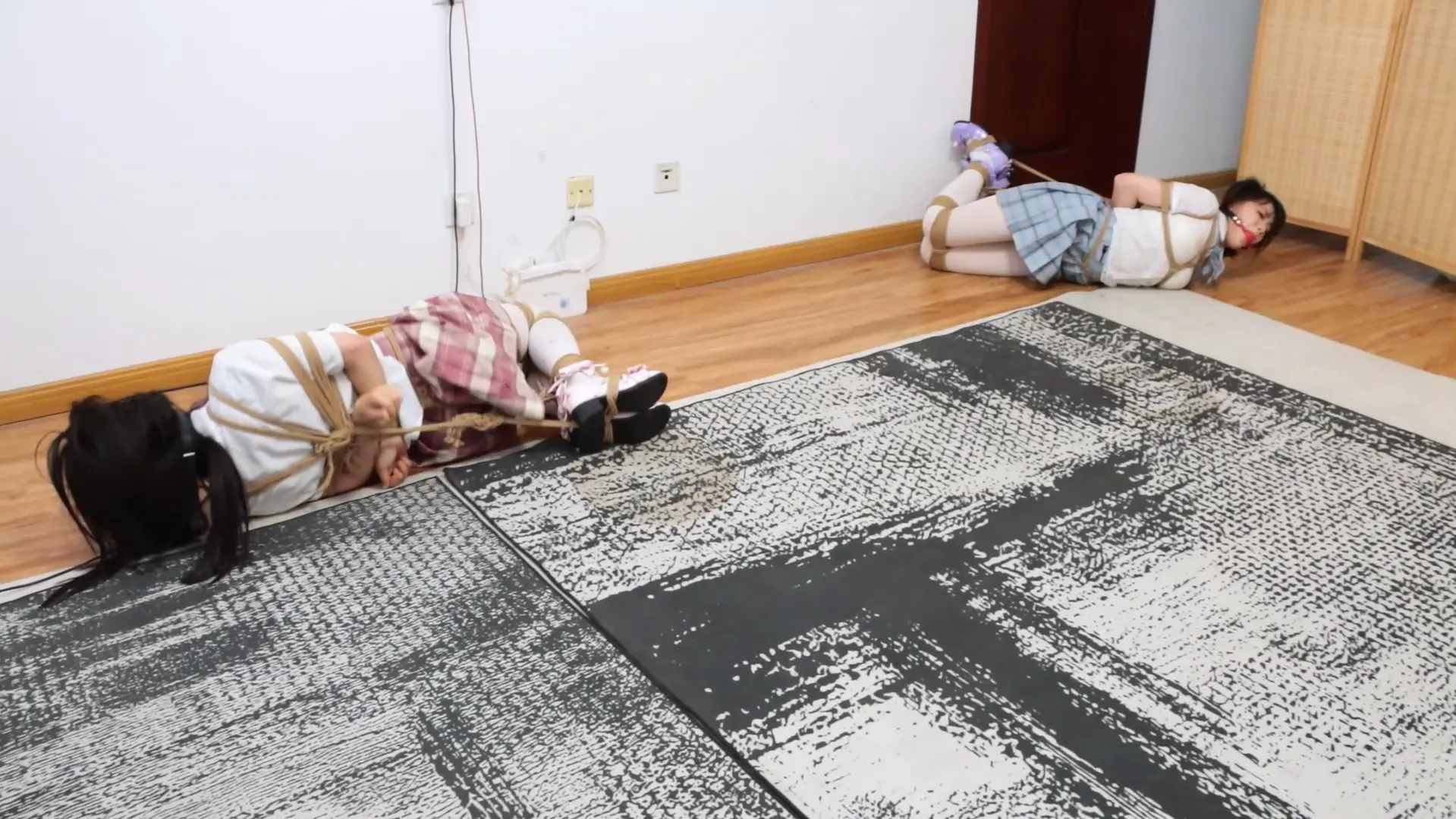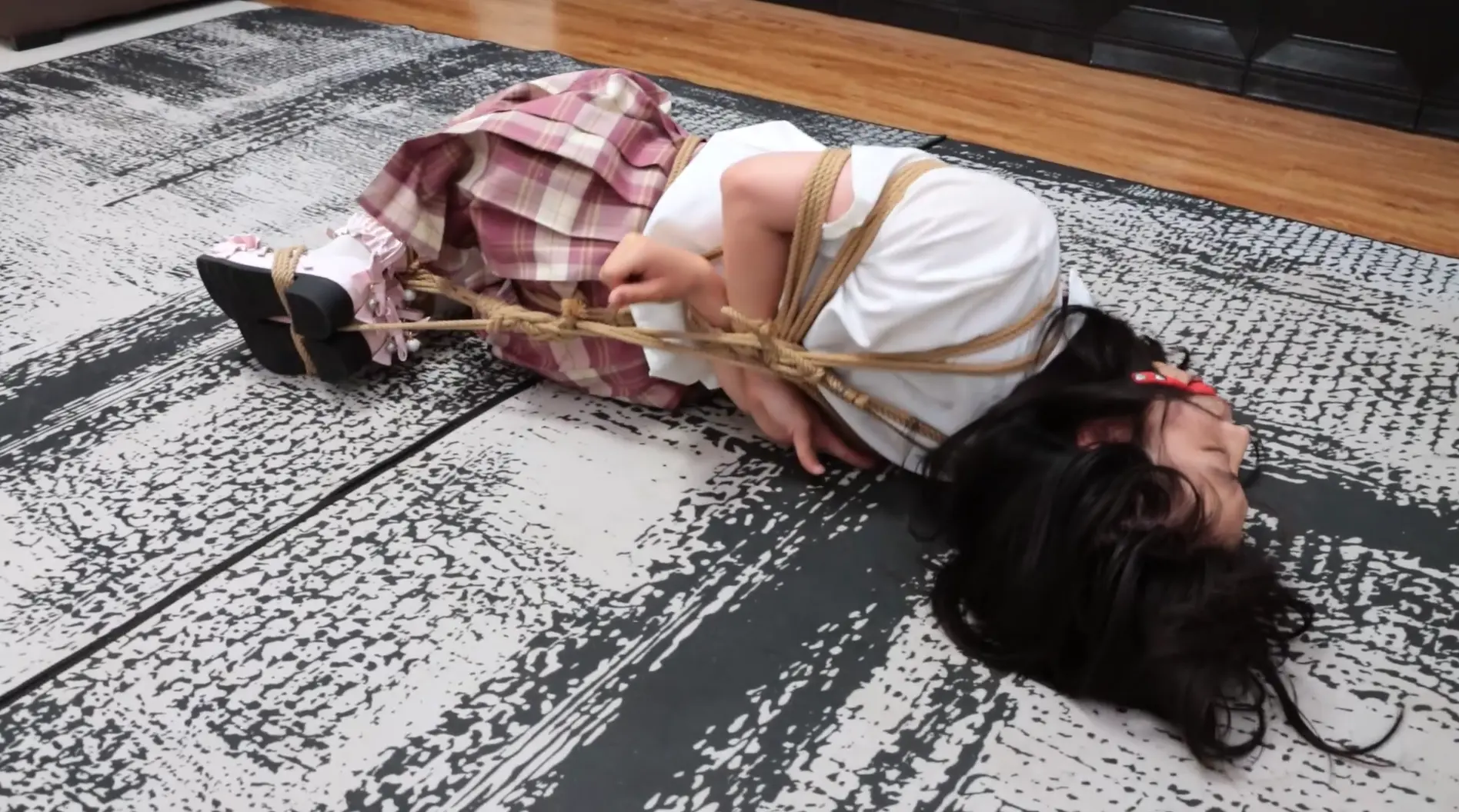 捆绑方式:日式后手缚,并拢捆绑脚掌并在中间收紧,口球堵嘴,股绳