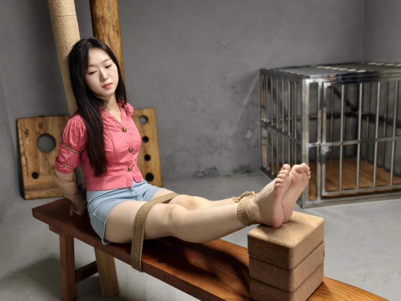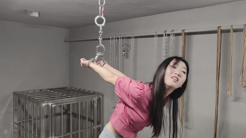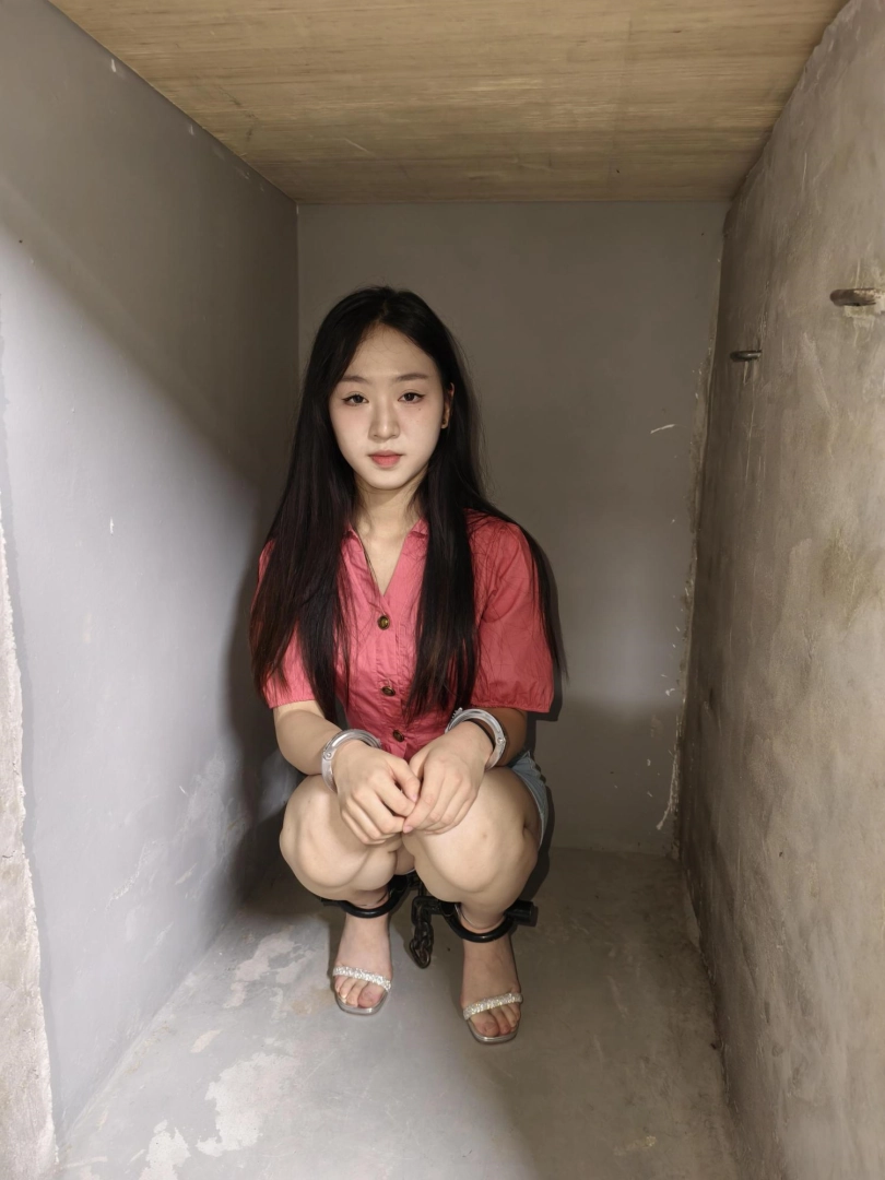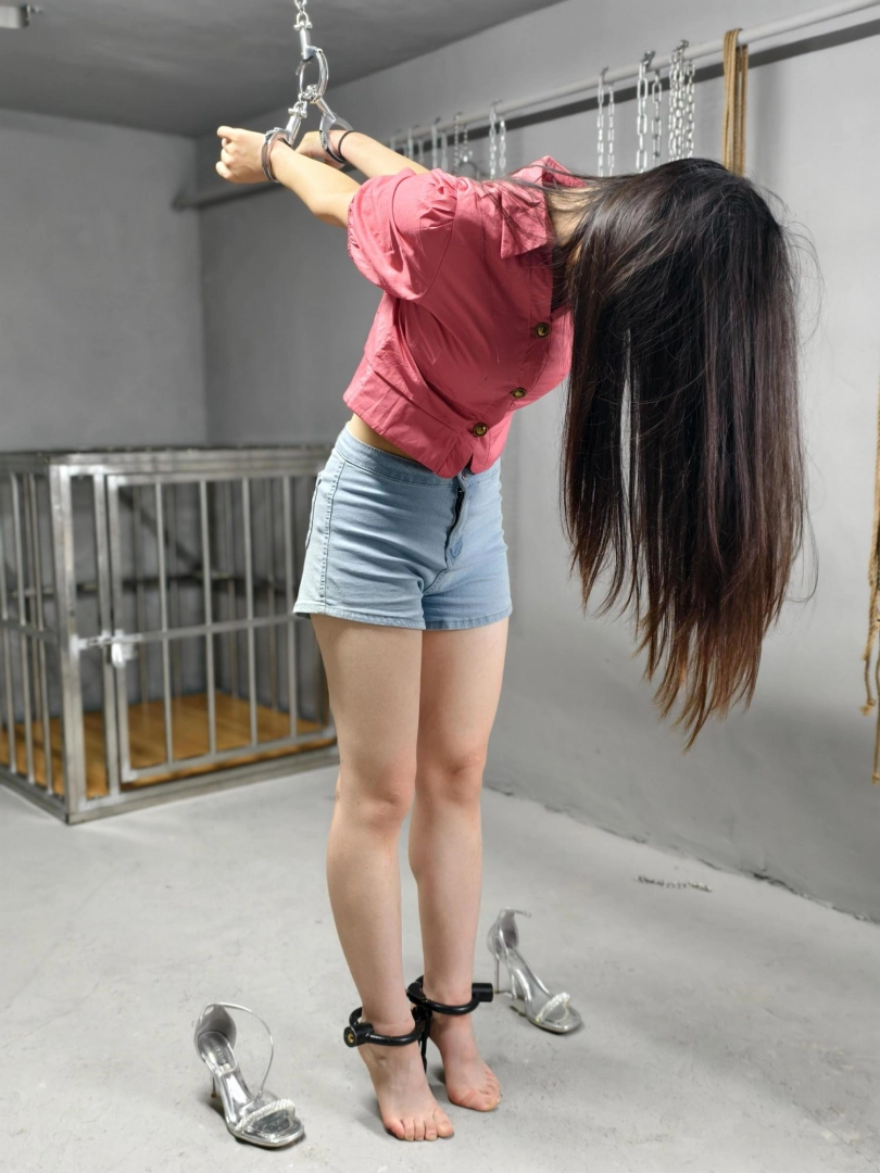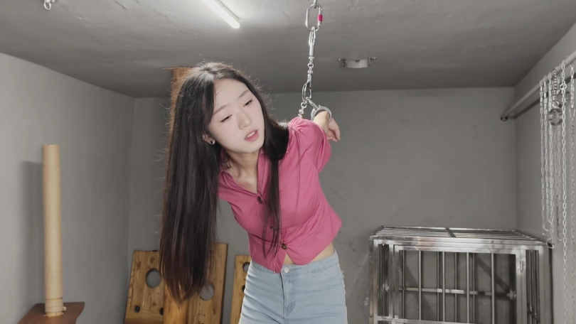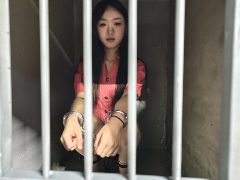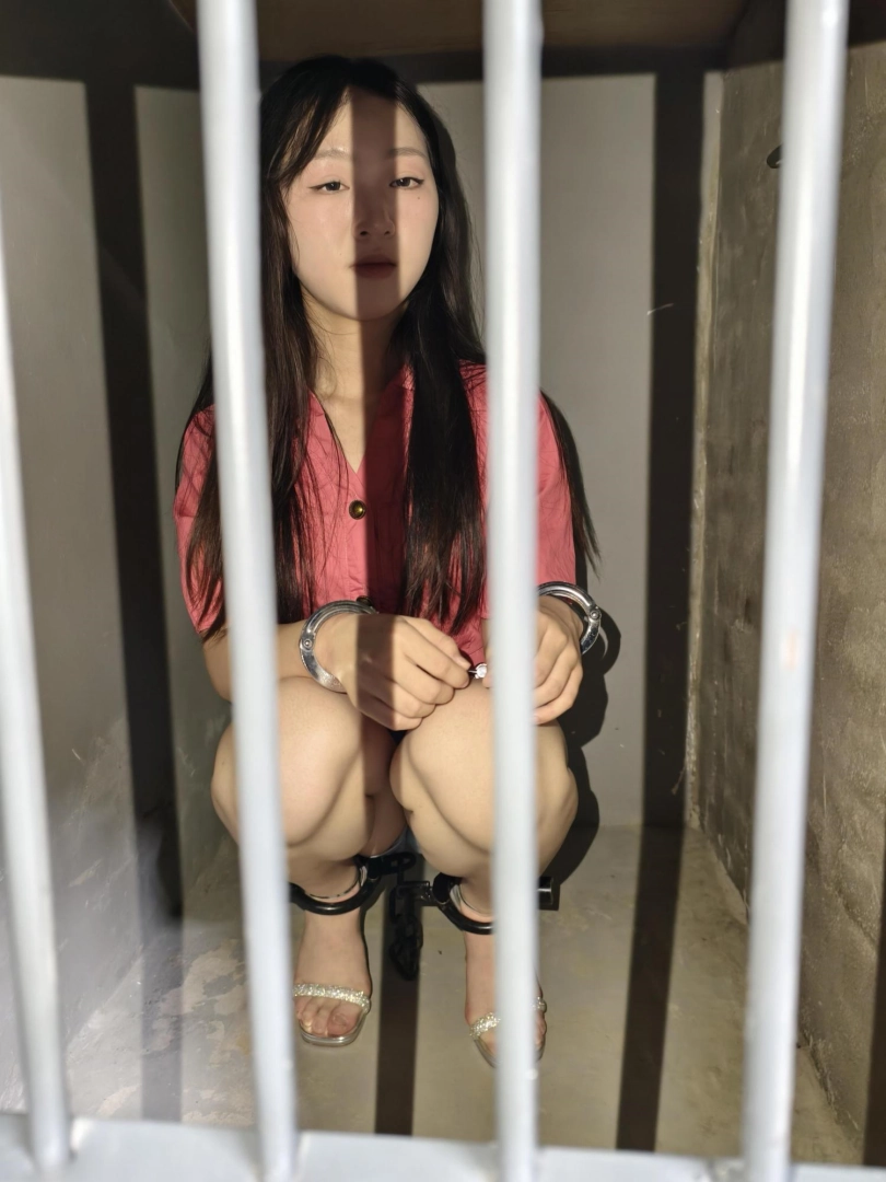 【忘忧社】新模特美女记者林嘉来名叫忘忧社的监狱风格体验馆体验,当女犯的一天,带手铐脚铐,脚镣,以及犯人不听话会遇到的各种刑罚,后高手吊起来,关笼子,上老虎凳等,度过了难忘的一天。