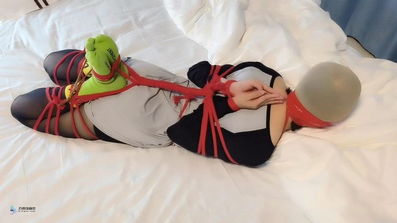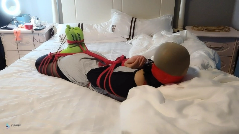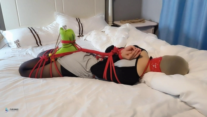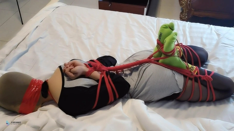 柔韧度还是很不错的。用红色的绳子将上半身绑成后手观音,再加上分腿缚,最终绑成驷马姿势。本来想丝袜堵嘴的,但她比较排斥,所以就没塞嘴。用丝袜头[X_X]头,胶带缠绕嘴巴。当然,脚趾头也不能发过,用一根比较细的绳子把她脚趾头也绑起来。嗯,完成,开始挠她的脚心。激辣只能小幅度的挣扎,呜呜叫。