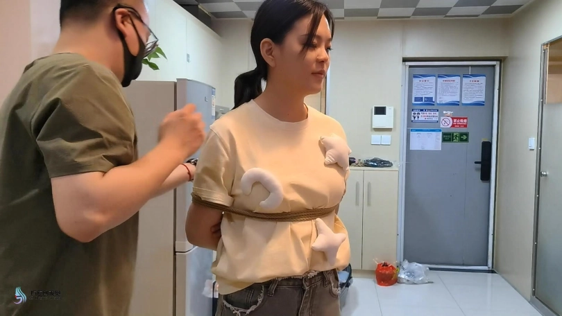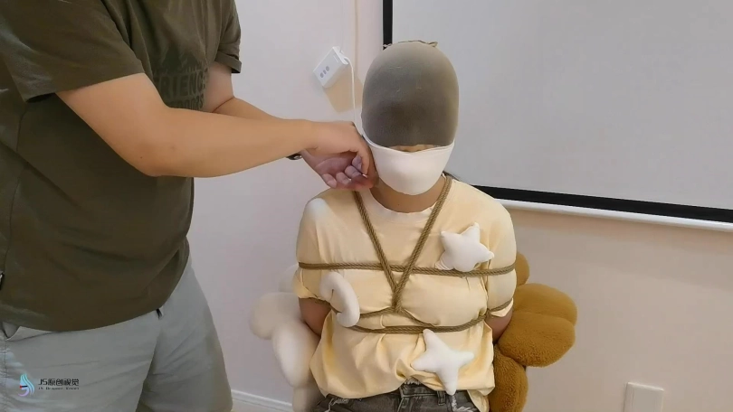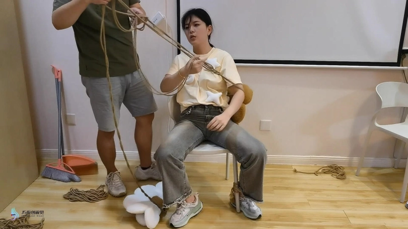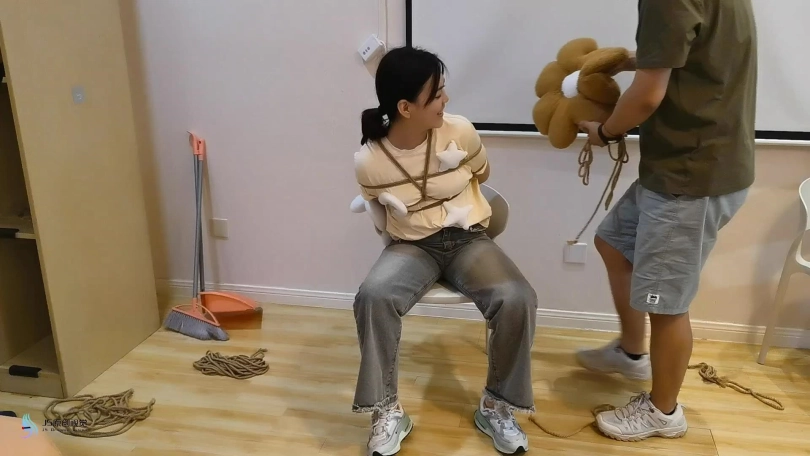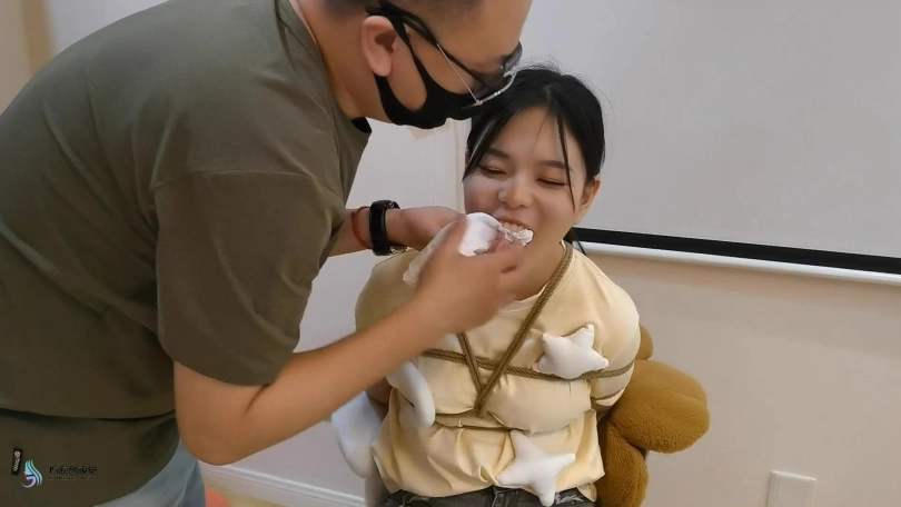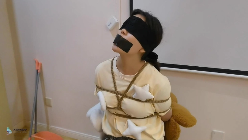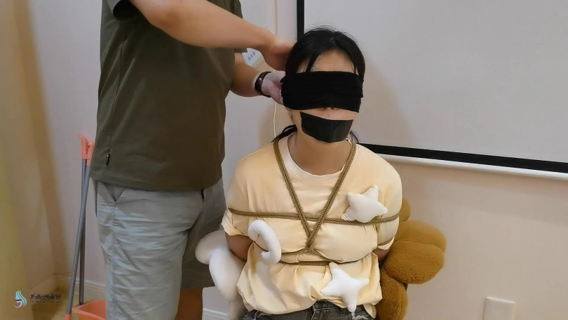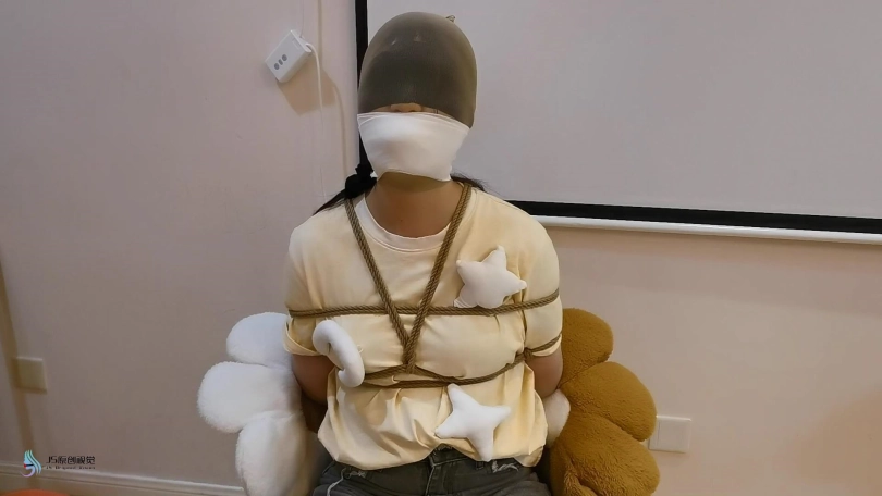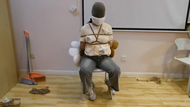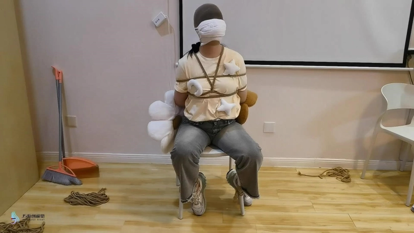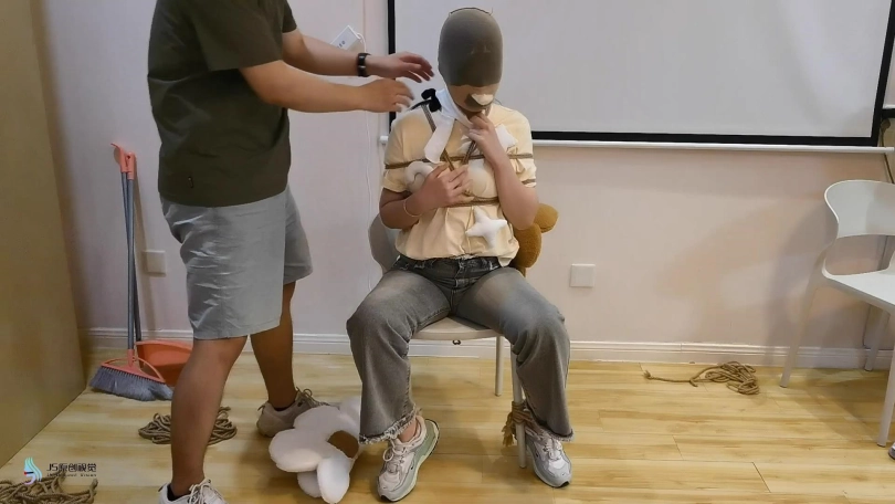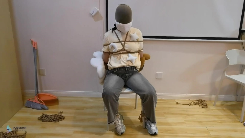 【JS】【梦琪】椅子上的束缚毛巾塞嘴胶带丝袜头套绷带口罩严密封堵