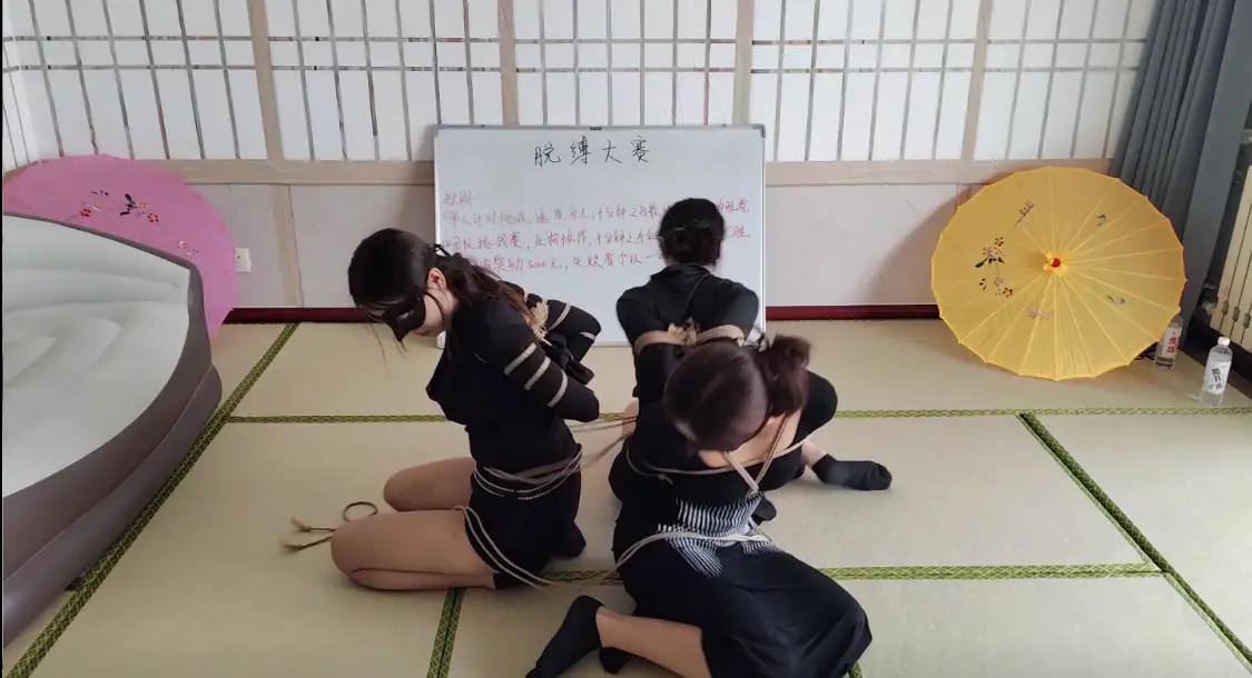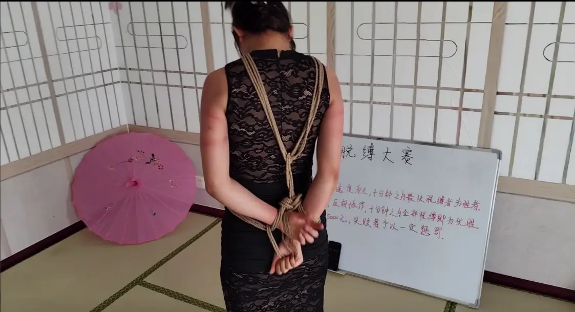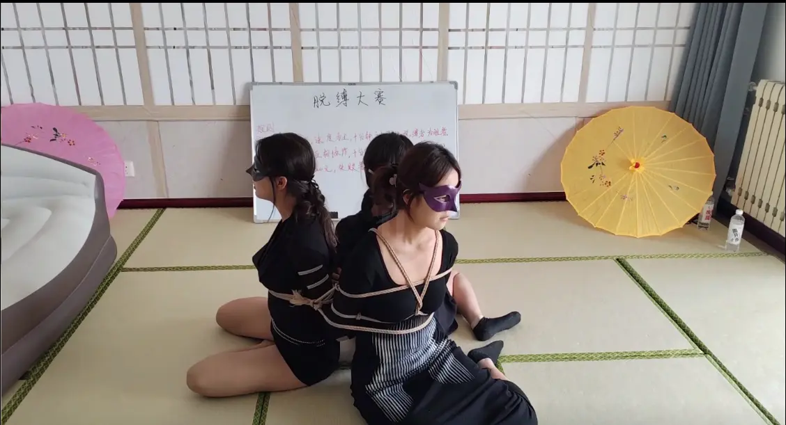 共三位美女参加(林晓雅,李伊可,玖儿),分为两部分:第一部分,个人竞速赛,同样驷马造型,速度快者优胜,慢着惩罚。第二部分,团队脱缚赛,在规定时间内完成则为优胜,未完成视为失败,予以惩罚。