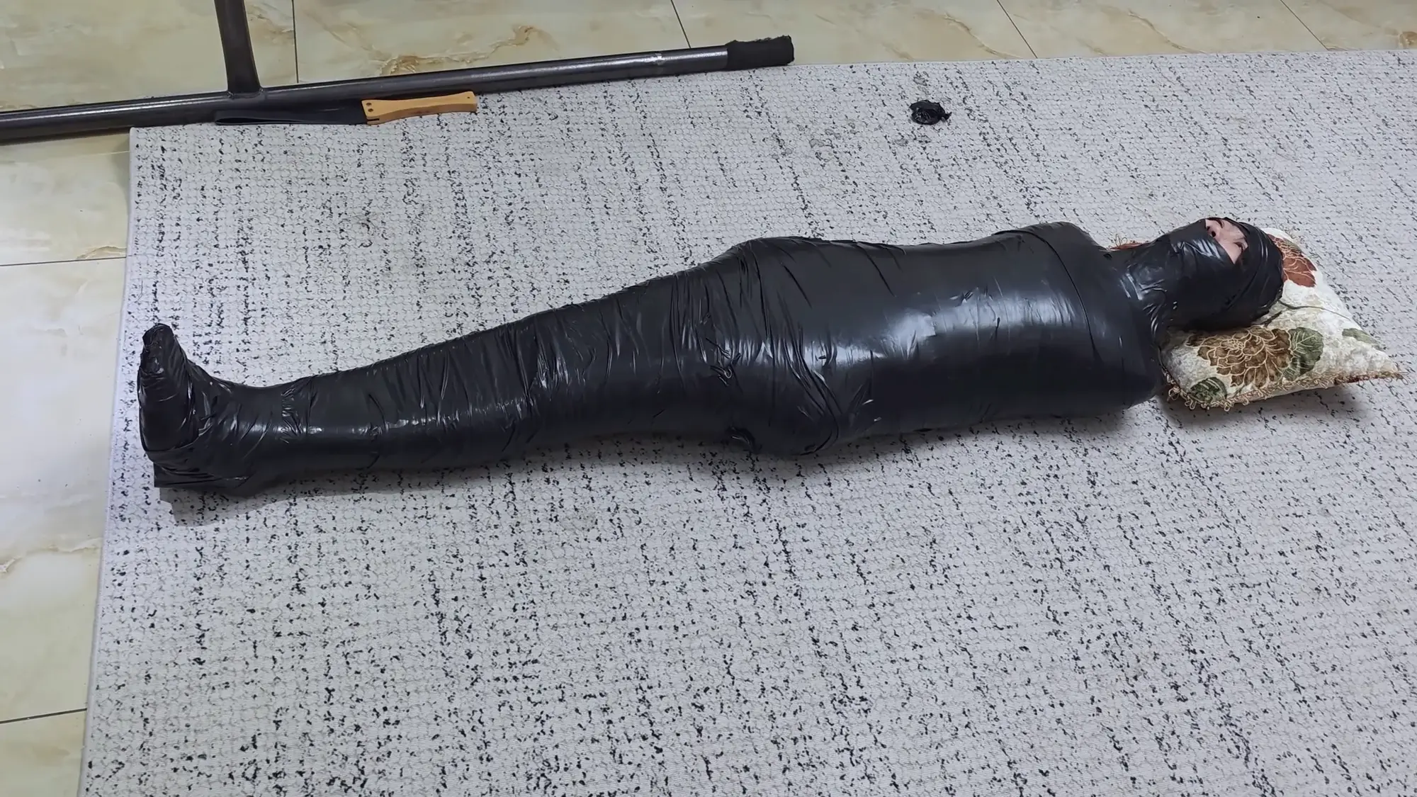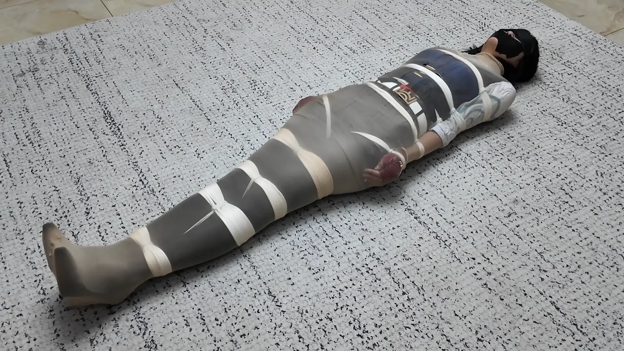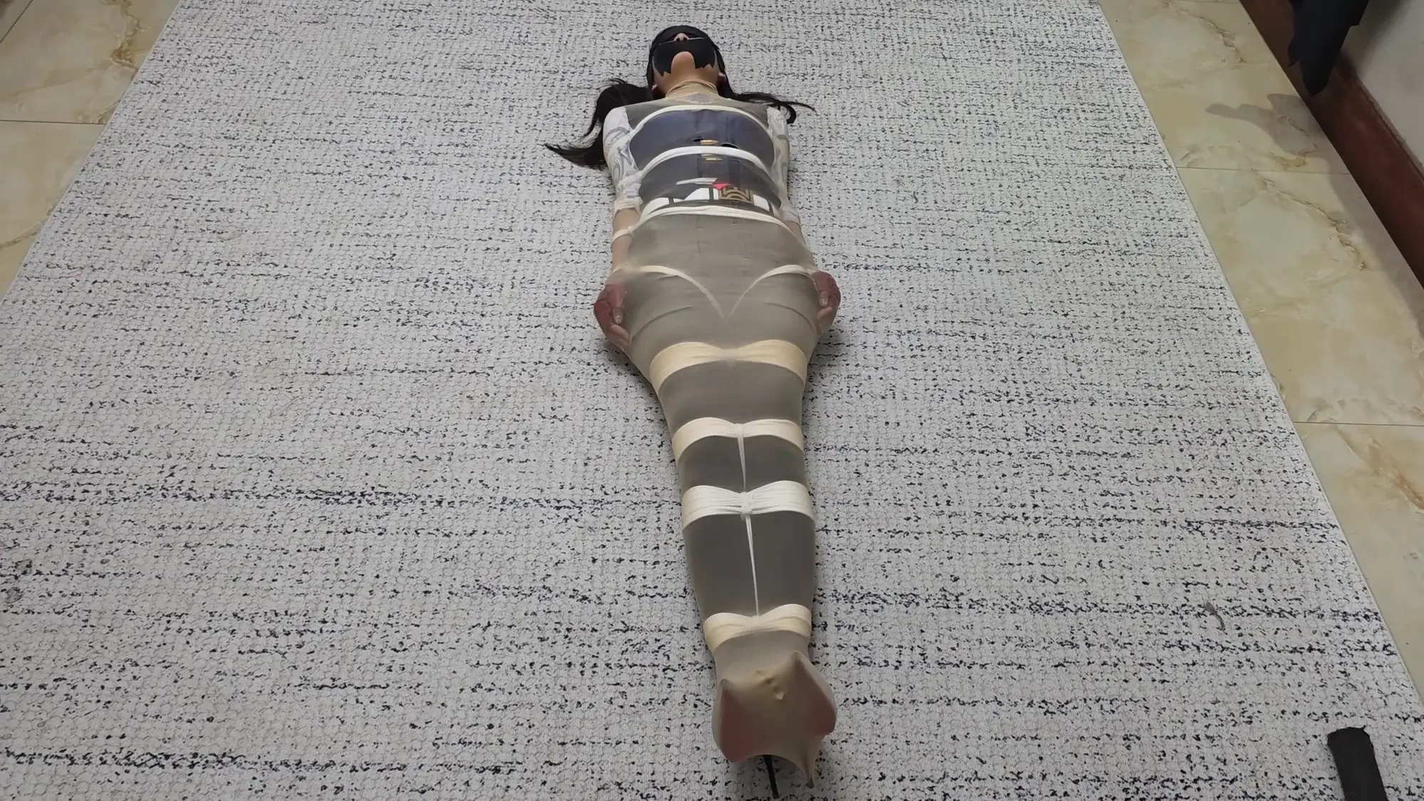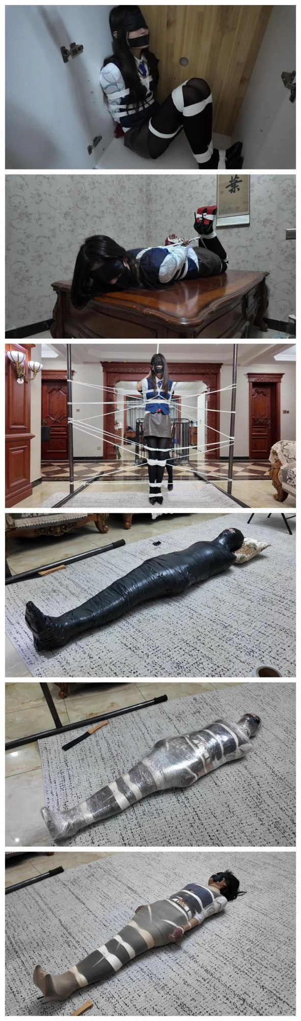 完成了后,米粒欣赏了一下自己的作品,非常满意,任由雨琦在地上尖叫,挣扎。并说:喜欢吗,这是给你的最后的礼物,累坏我了。说完,像抚摸艺术品一样抚摸着被全包的雨琦。最后,米粒说:好了,你在这等着吧,会有人把你接走的。然后就离开了。雨琦绝望了使劲挣扎也没有用。放置了一会后,有一个陌生人进来,说:你这是怎么回事,怎么被绑成这样。雨琦以为救星来了,就不停的喊。然后陌生人说:不要怕,我帮你报警。说着拿起手机打电话,然后说:嗯,我对这次的货很满意。我会把钱打给你的。雨琦听后害怕的摇摇头。陌生人把电话给雨琦听,电话那头传来米粒的声音:雨琦啊,这个客户你应该也见过,是你小情人的竞争对手啊,最喜欢给人希望然后又给人绝望的,希望你不要怪罪哈。客户摸着雨琦的脸,然后说:那家伙眼光挺好的嘛,可惜了,那你就和我回家,让我好好玩玩吧。说完用易碎品胶带把雨琦