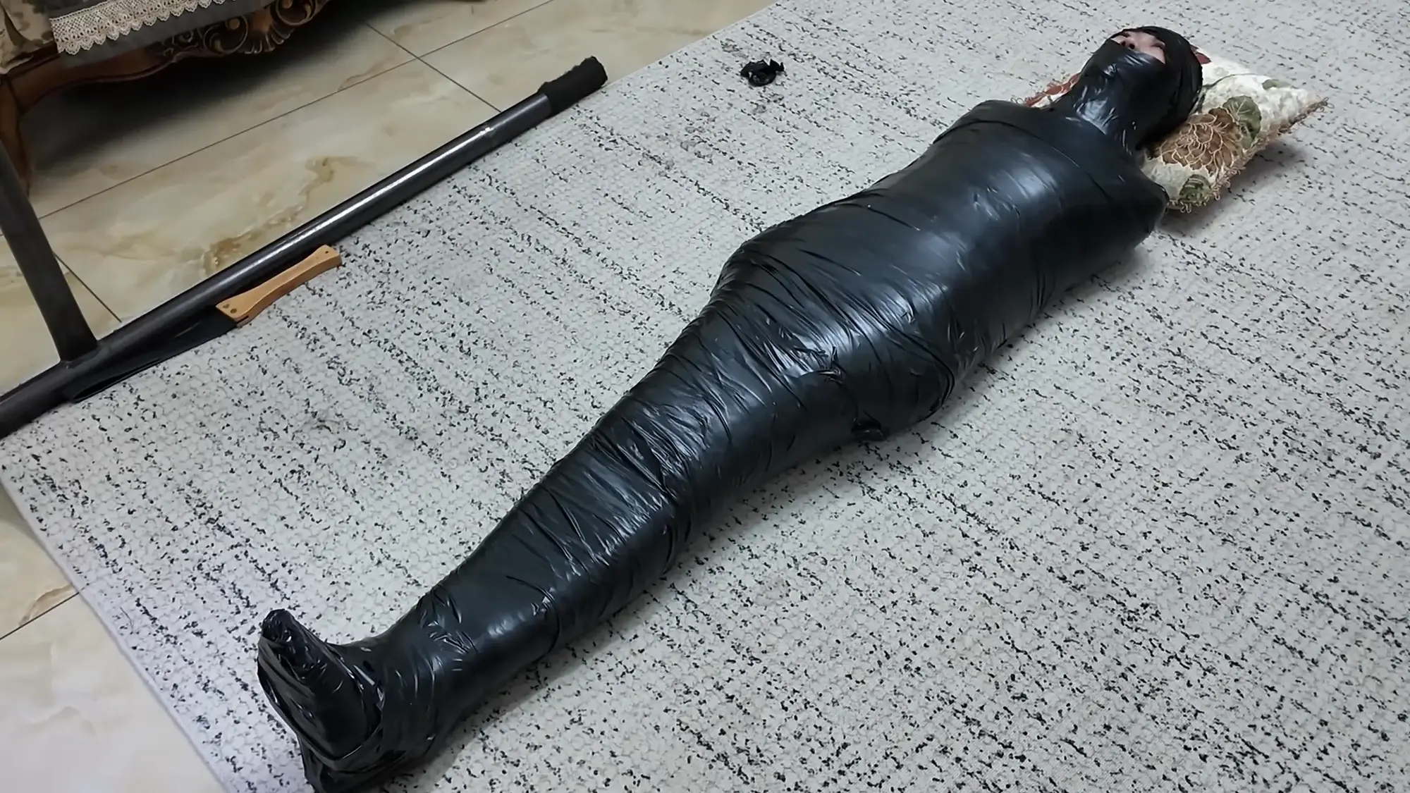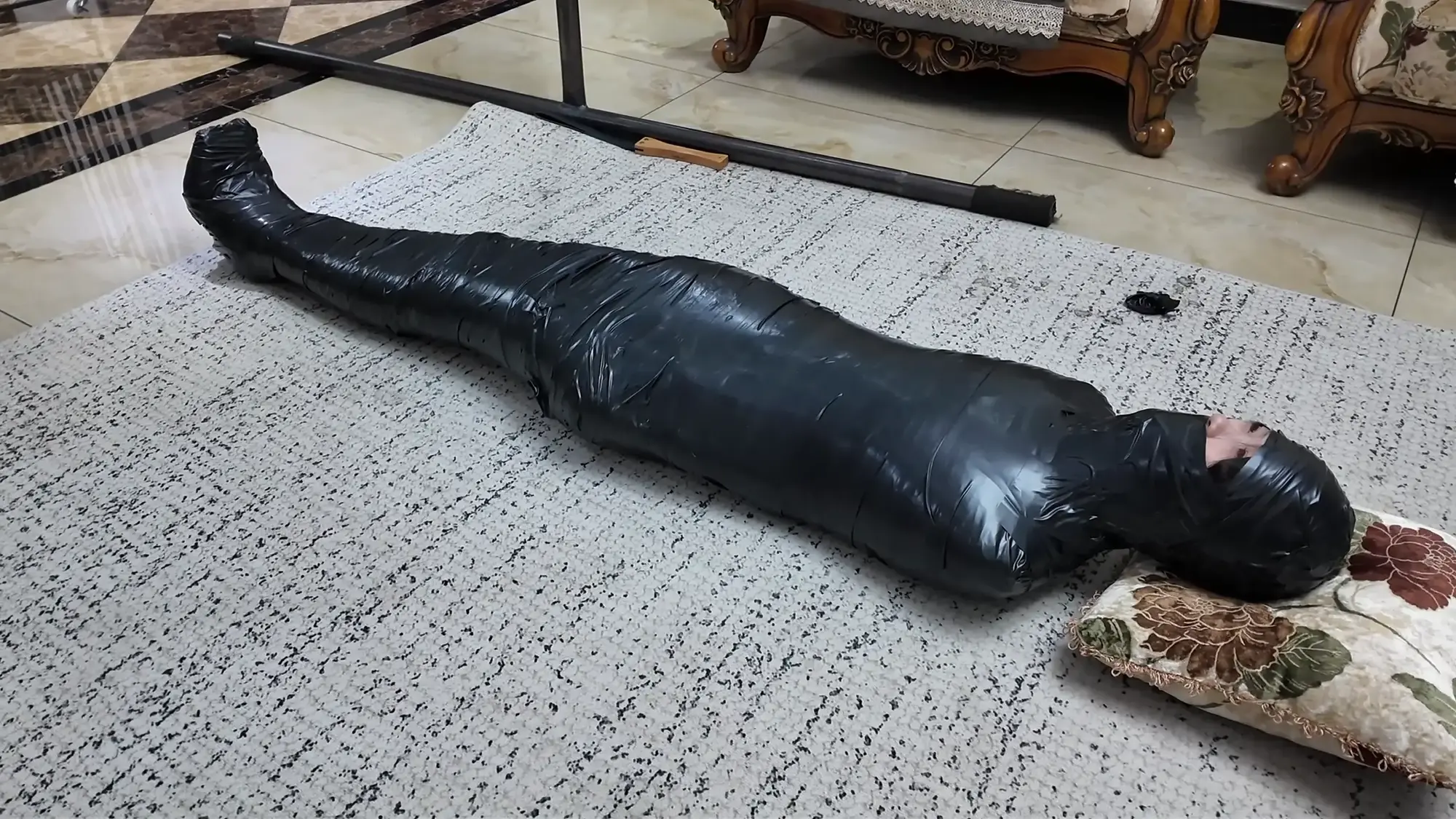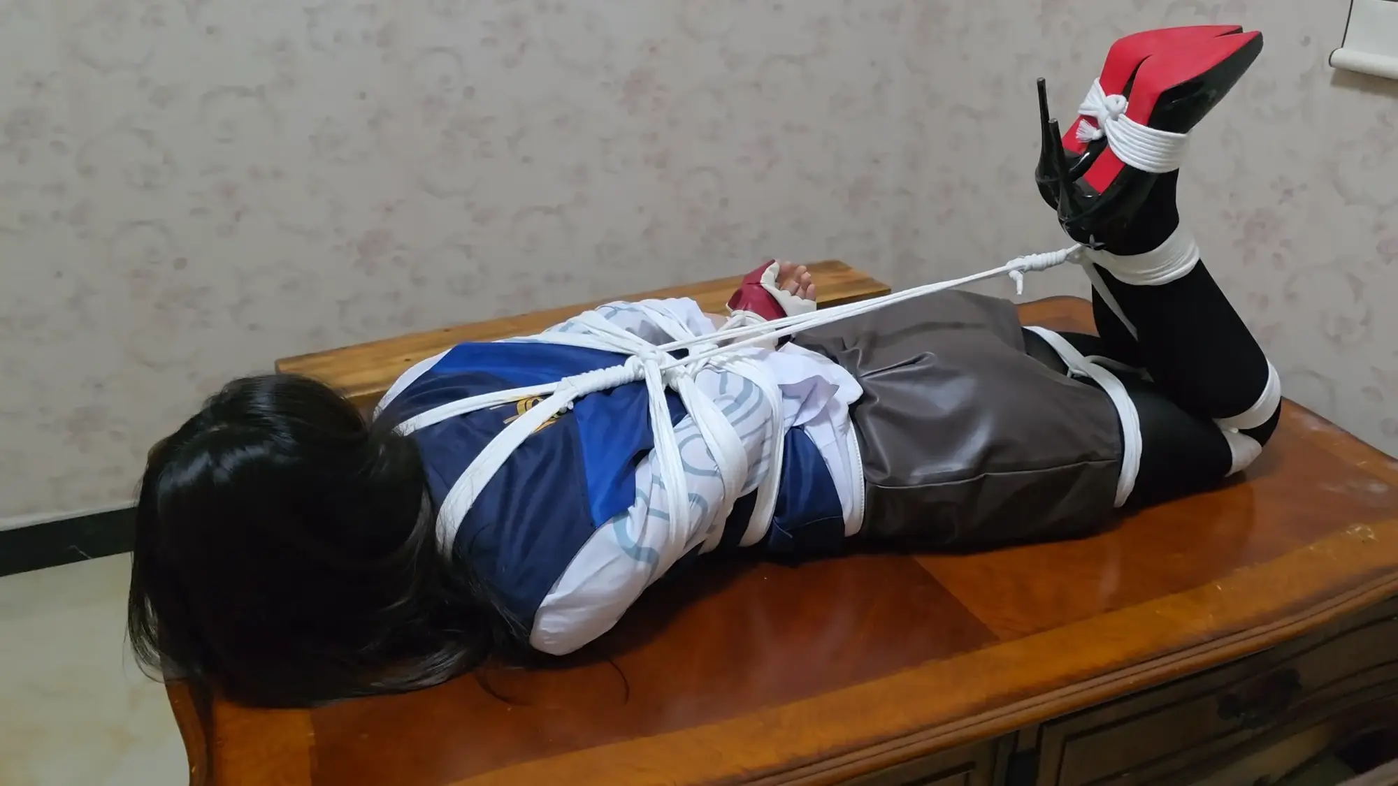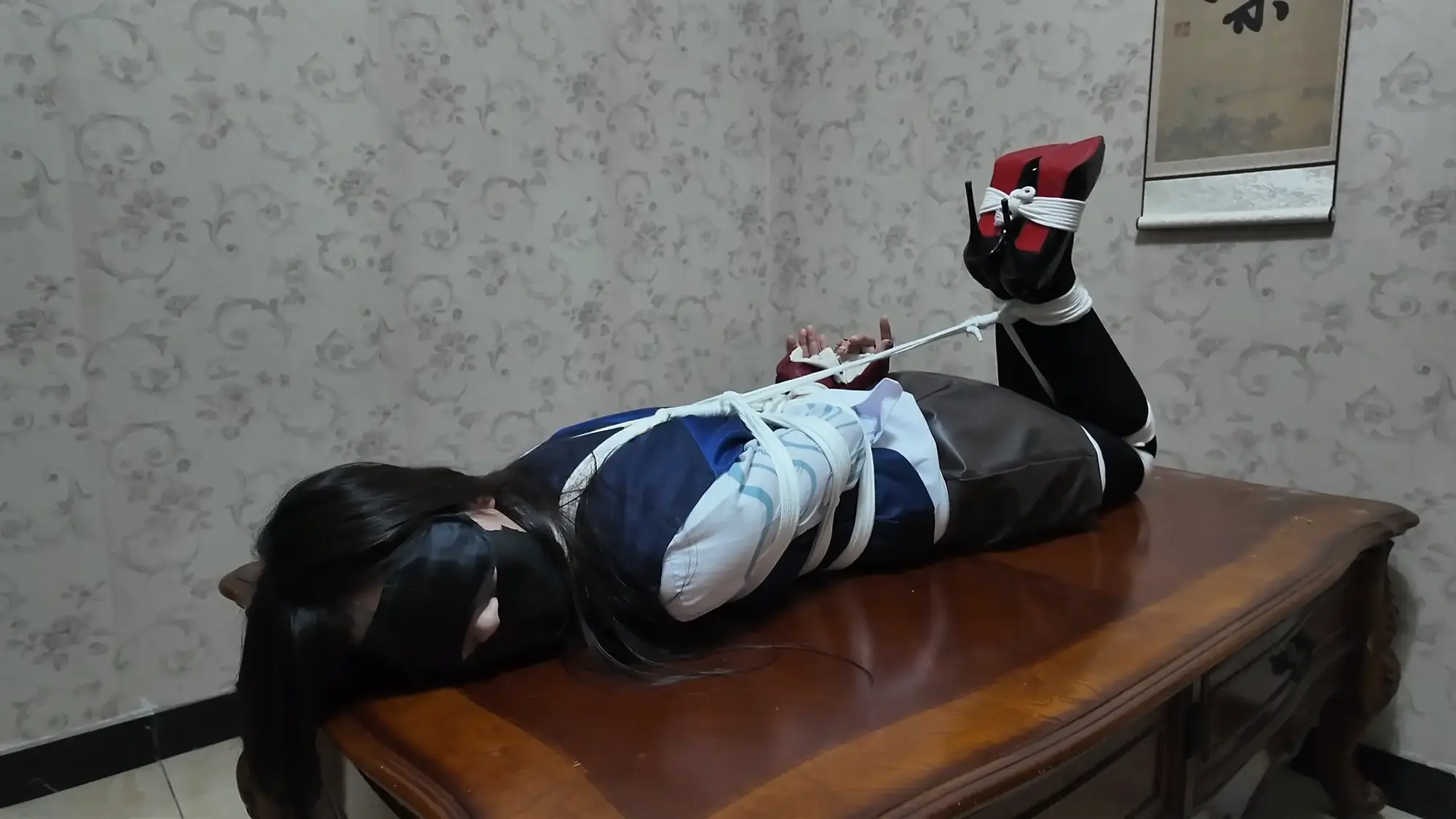 雨琦被绑的十分痛苦,不断挣扎,而且茶几离地面有高度,还要注意不能掉下去。
