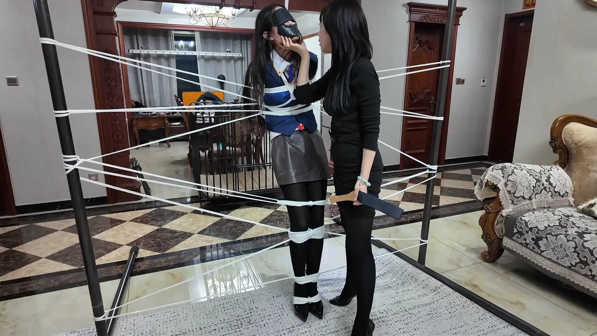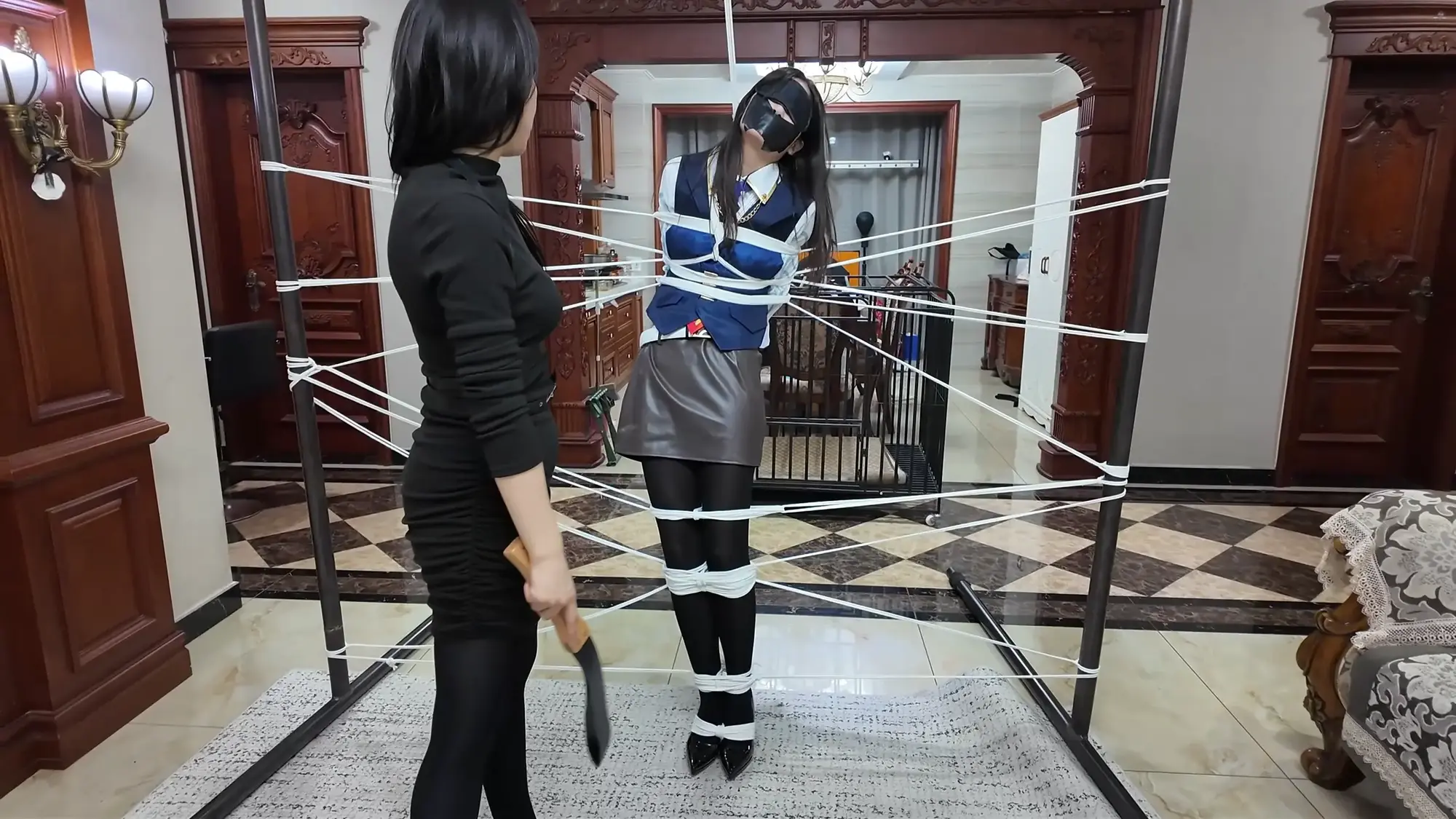 来到客厅,米粒用绳子把雨琦绑在架子上,