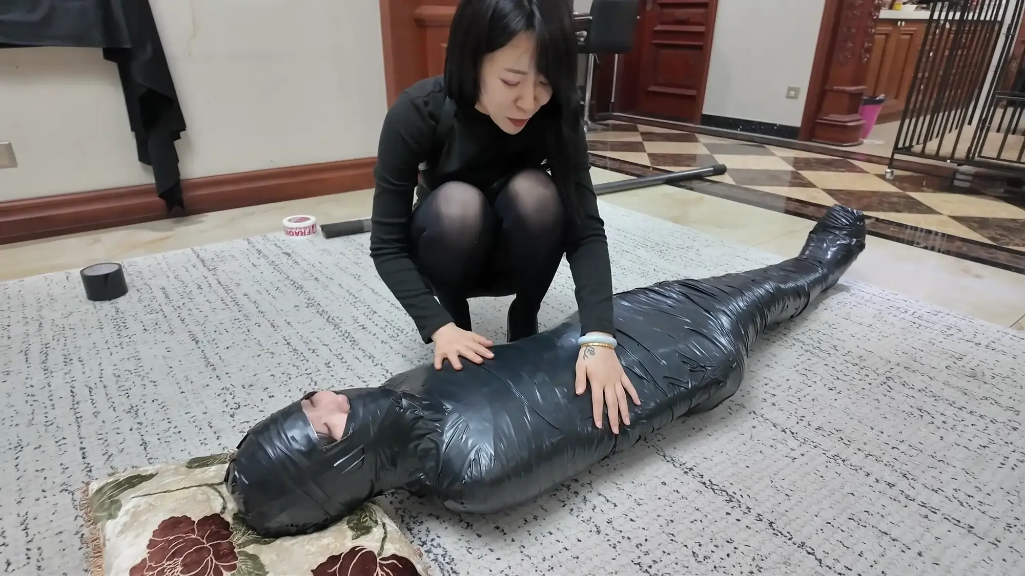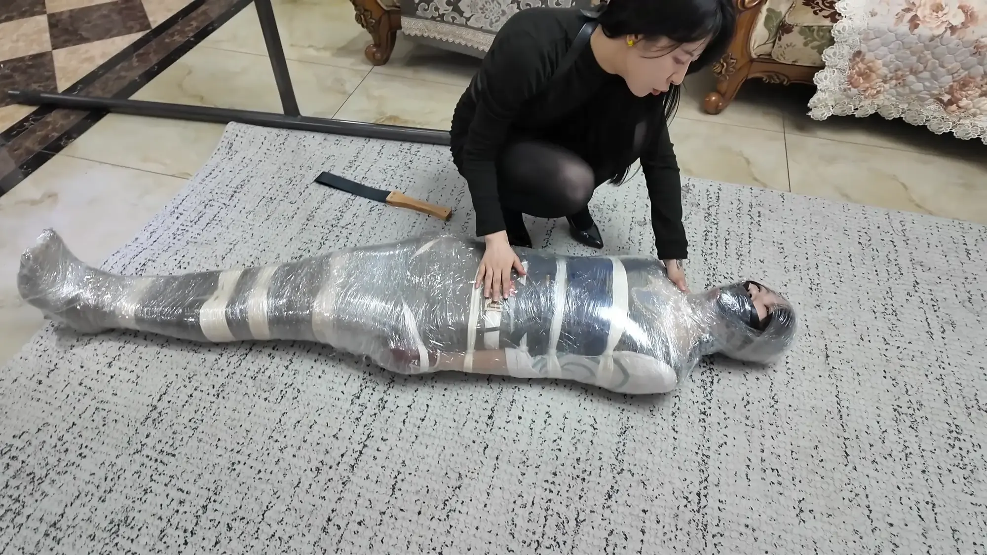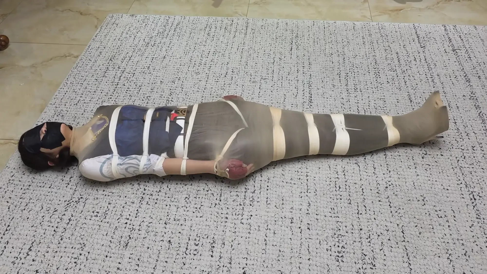 雨琦很害怕,一边挣扎,一边往门口蠕动,快到门口的时候,米粒回来了,雨琦很绝望,放声大叫起来,米粒马上把雨琦的嘴捂住,骑到她身上,然后对雨琦说:死狐狸精,再叫,我就马上把你杀了,给我安静一点。雨琦只能害怕的点点头。米粒接着说:你很幸运,有人出价买你。可惜我不能折磨你了,省的打坏了让我赔钱。说完展示了一下手中的袋子,里面装着保鲜膜和胶带,用保鲜膜把雨琦一层一层包起来一边包一边说:想你这样的大美人用保鲜膜包起来,还可以保住你的美貌呢,乖不要乱动。不然我就给你放冰箱里冷冻起来。雨琦哪见过这些东西,吓得不停尖叫