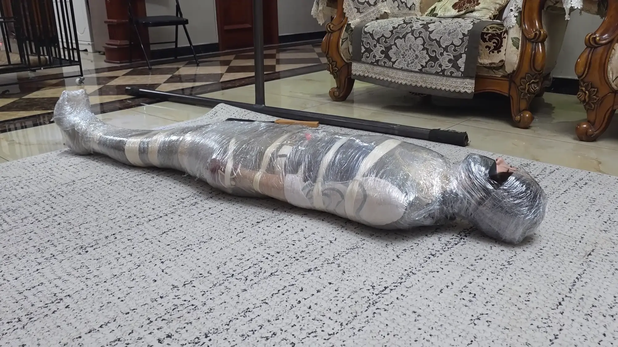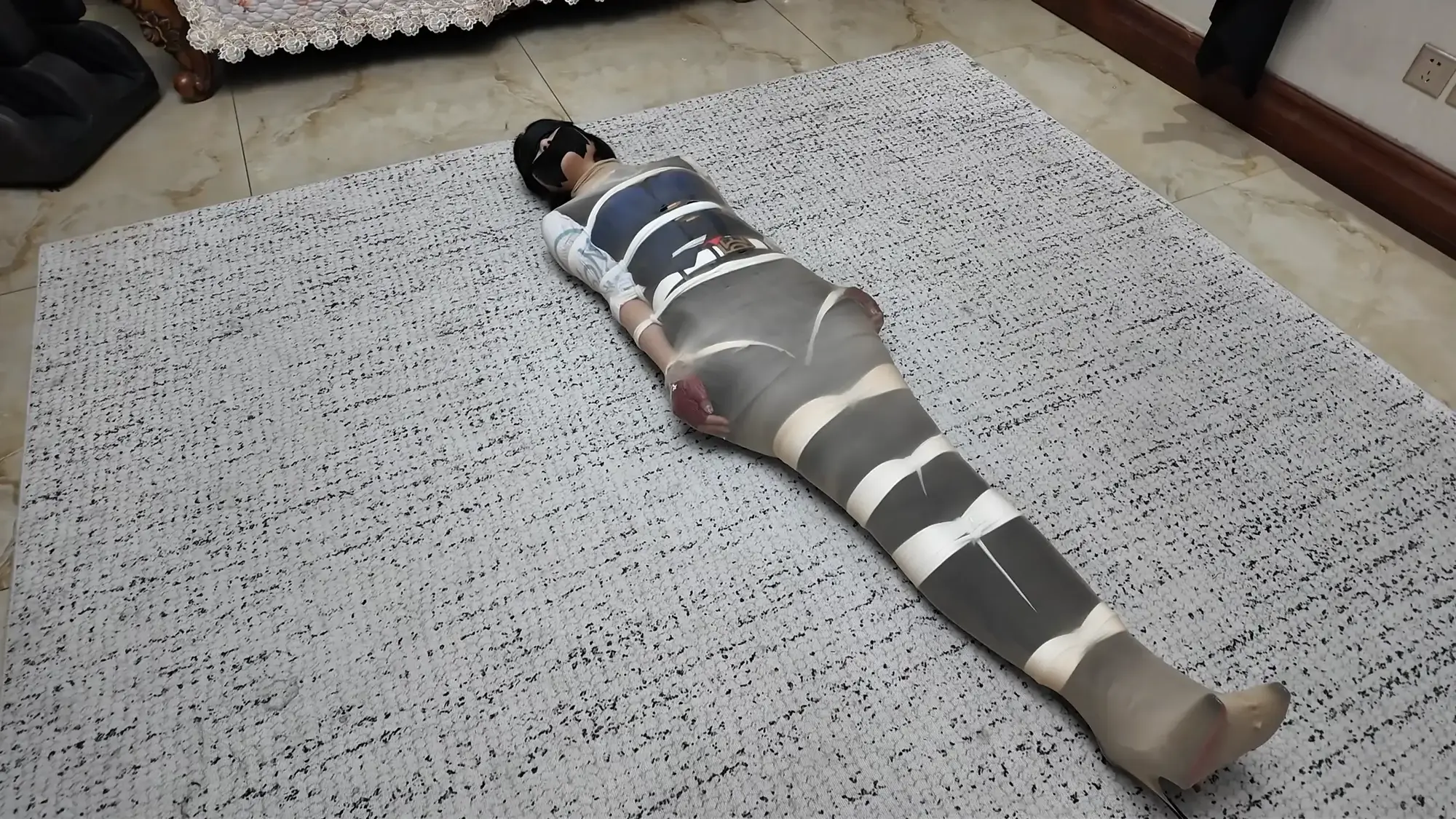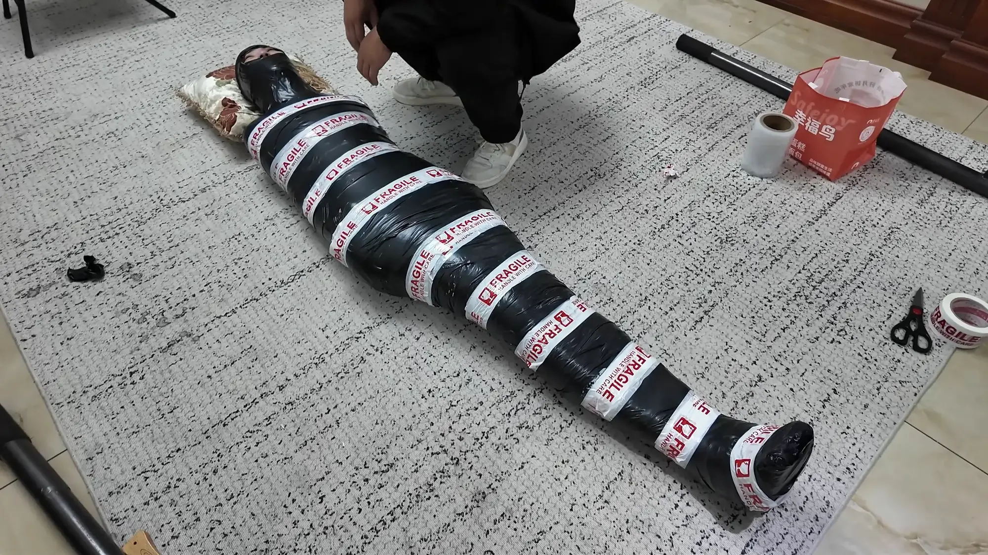 雨琦很害怕,一边挣扎,一边往门口蠕动,快到门口的时候,米粒回来了,雨琦很绝望,放声大叫起来,米粒马上把雨琦的嘴捂住,骑到她身上,然后对雨琦说:死狐狸精,再叫,我就马上把你杀了,给我安静一点。雨琦只能害怕的点点头。米粒接着说:你很幸运,有人出价买你。可惜我不能折磨你了,省的打坏了让我赔钱。说完展示了一下手中的袋子,里面装着保鲜膜和胶带,用保鲜膜把雨琦一层一层包起来一边包一边说:想你这样的大美人用保鲜膜包起来,还可以保住你的美貌呢,乖不要乱动。不然我就给你放冰箱里冷冻起来。雨琦哪见过这些东西,吓得不停尖叫