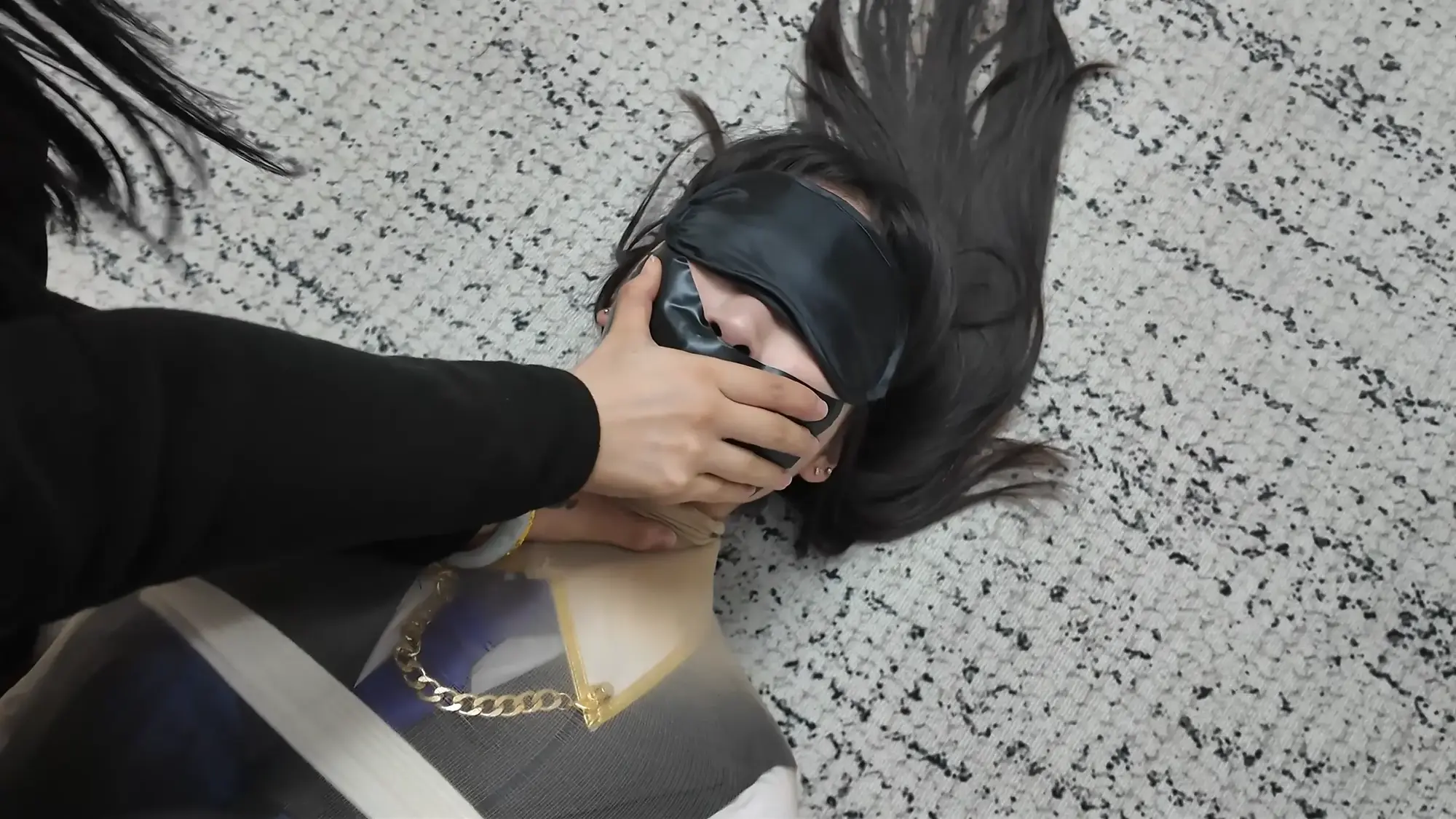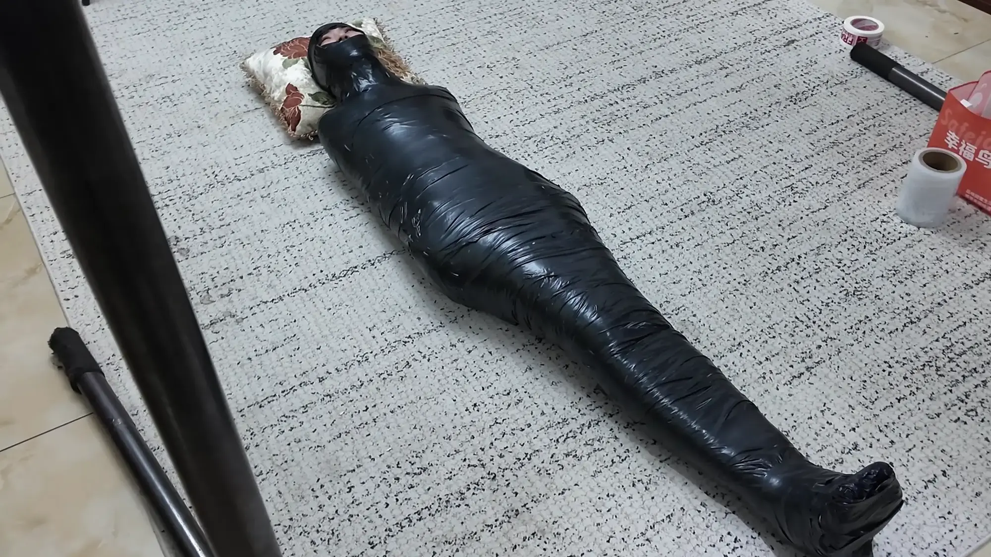 接着用剩下的pvc胶带把雨琦眼睛封住,就留个鼻子呼吸。雨琦非常害怕,不停的呼吸。然后客户将雨琦扛在肩上带走了。