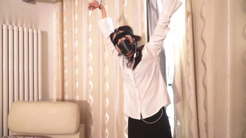 打手走了过来解下蒋梅的双脚,放在地上,将交叉的双腿解开改为并绑。之后解开蒙眼堵嘴,为她换上了马式口球,又蒙回了眼睛。再解开手铐和上半身的捆绑,并把她扶起来,双手各拷一个手铐,各与窗帘架子上的绳环相扣。蒋梅整个人呈Y字型,双手被吊起来,双脚掂着脚尖。
