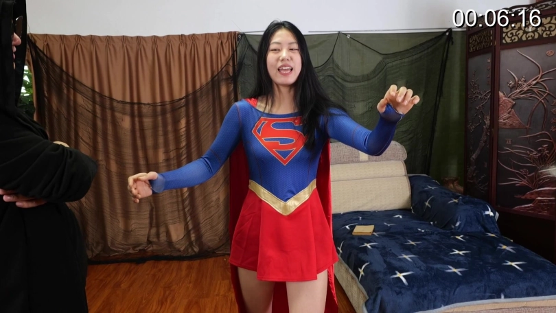 最后一幕,女主上身直立双腿向前伸,脚底直冲镜头,两手比耶,面露微笑,眼睛睁着,舌头吐出,像雕塑一样坐在屋子中间。镜头特写从女主脚开始向上一直到脸部(脚部和脸部停留时间可以稍长些)。男主手指点中女主额头,女主两臂垂下,两眼无神,头略微低下(给下眼睛特写),男主:“堂堂女超人,现在是我的尸奴啦,现在做个自我介绍吧。”女主:“好的主人,我是女超人,生前是地球防卫军第一战斗团首领,现在是属于主人的一具尸体,随主人摆布。”男主:“好,现在带我去找到你们组织的秘密吧。”女主:“是,主人”然后女主起身跟随男主离开,镜头可以给脚特写。