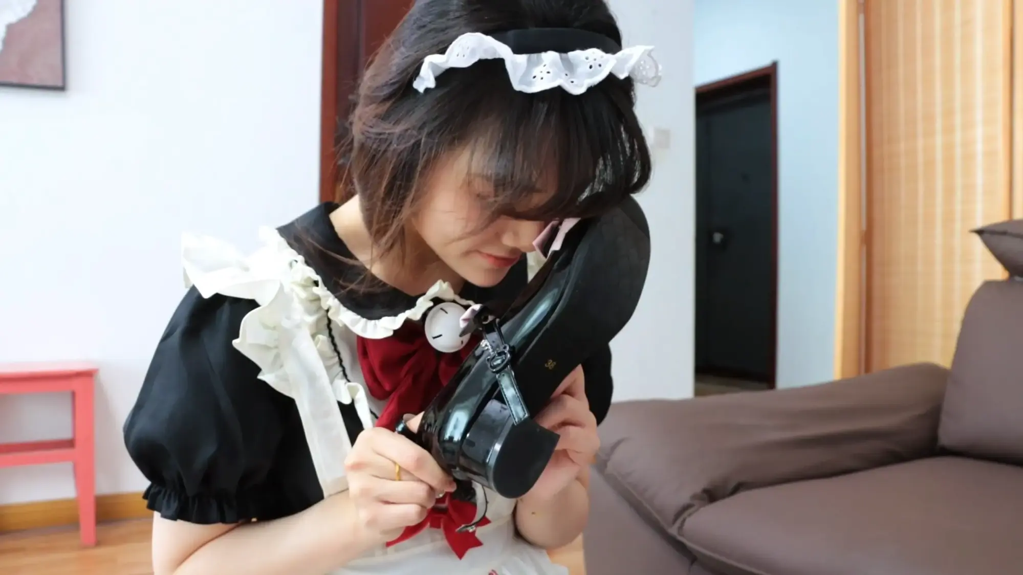 梦尘一扭一扭地爬到绮娜面前,用嘴帮绮娜脱掉了两只鞋子,然后绮娜拿起一只鞋子,蹲在梦尘旁边,用鞋子抽打梦尘的屁股【要很用力打3下,要能听到很大的响声】,梦尘痛的直叫,但梦尘看出了绮娜的癖好,出于女仆的职业素养,仍然笑着说,