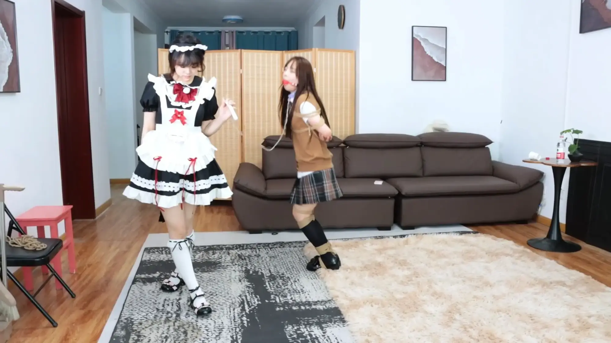 绮娜站起身将梦尘推倒在沙发上,压住梦尘,掏出绳子将梦尘的上半身绑成日式小高手【装模做样地绑一下,然后切镜头,工作人员给她绑结实了,胸上下各4股绳子,胸前v字,双手吊高一点】。绑好之后,梦尘挣扎着起身并且回到客厅中间,