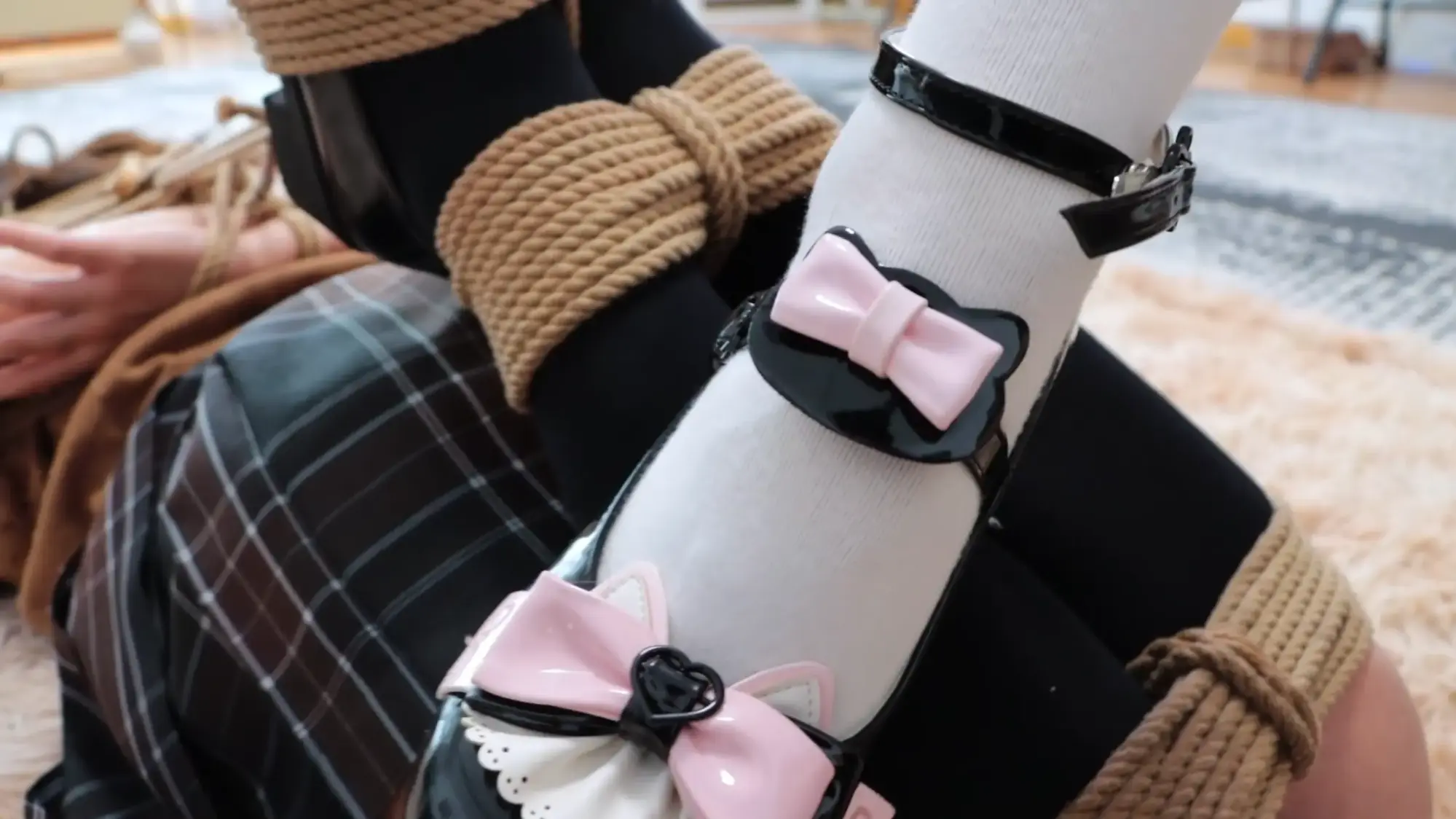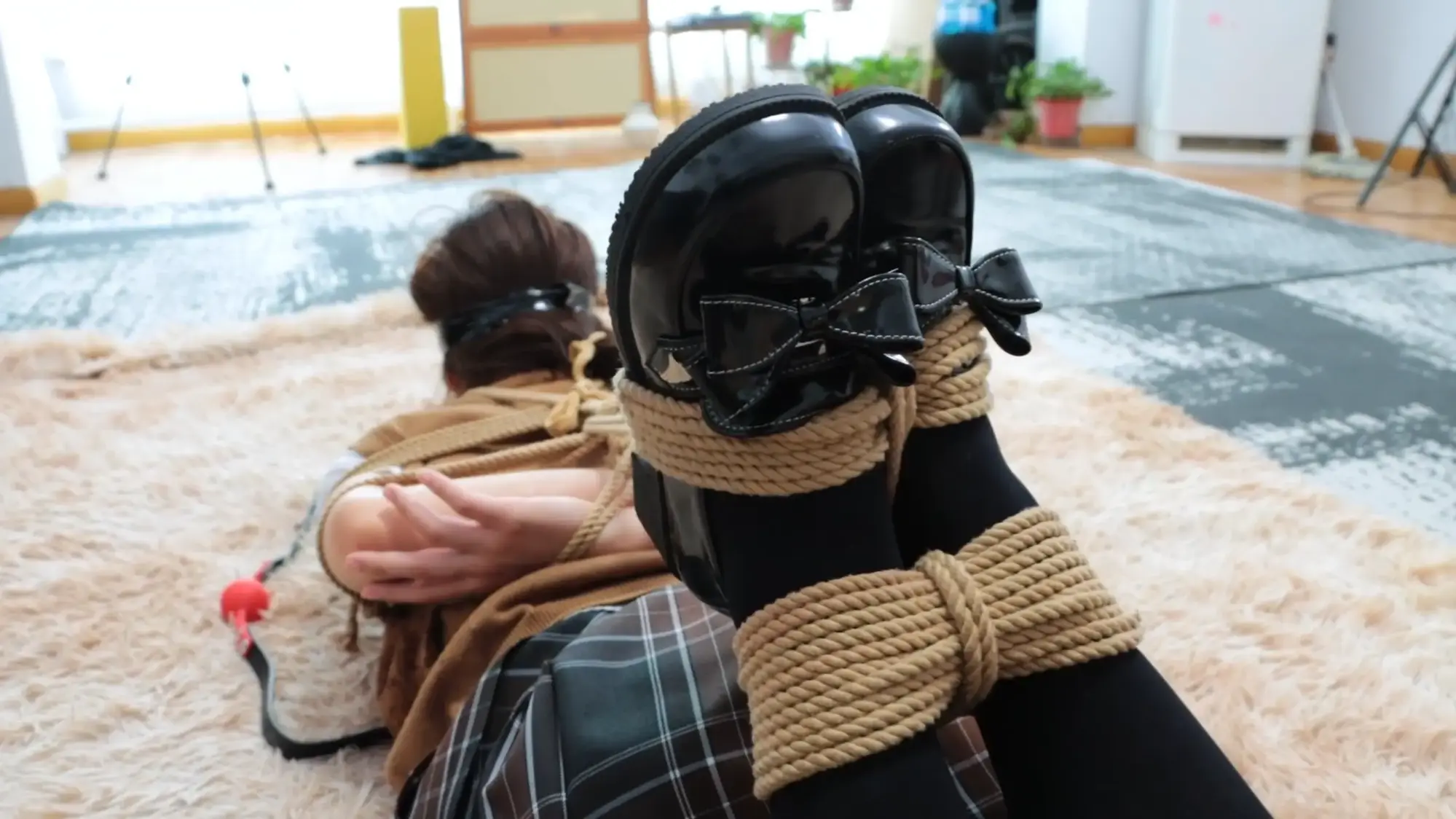 梦尘站在地上,乖乖地将自己的小腿都绑10-12圈并在中间收紧【梦尘如果自己绑不紧就切个镜头帮她重新绑紧】。绑好之后,