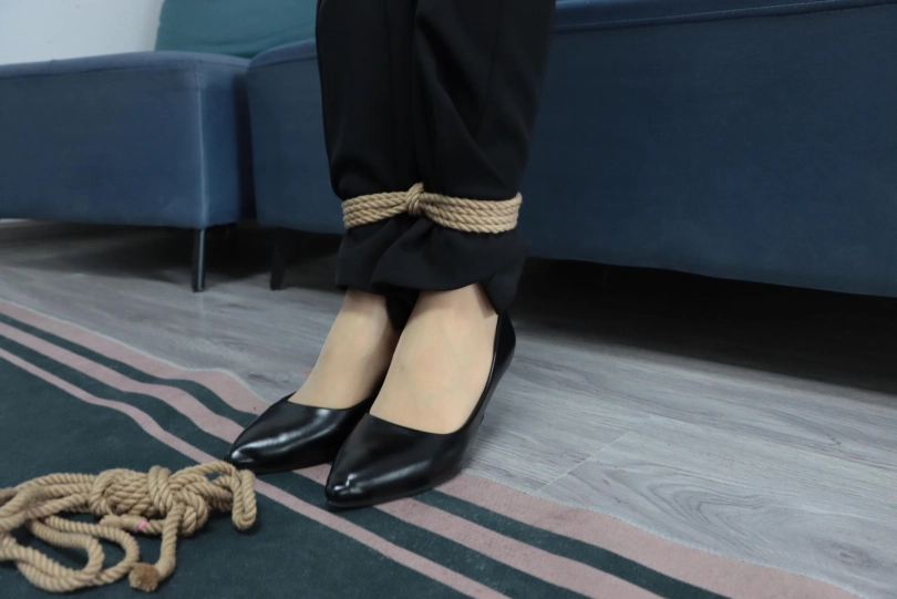 恩可给米娅穿上高跟鞋和短丝袜,用绳子将鞋和脚固定住。