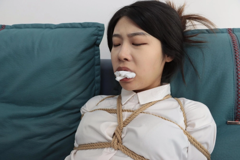 接着用短丝袜套住米娅的双手再用胶带缠住。