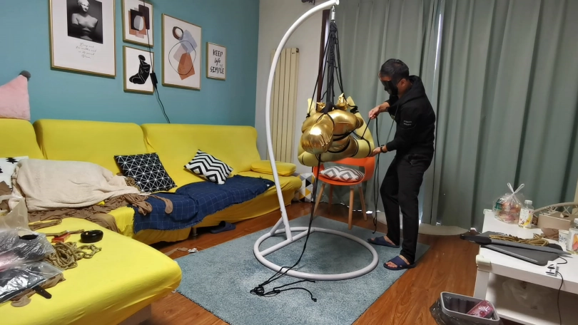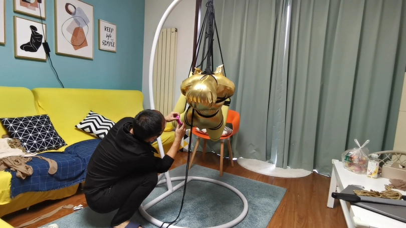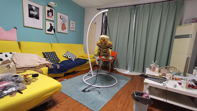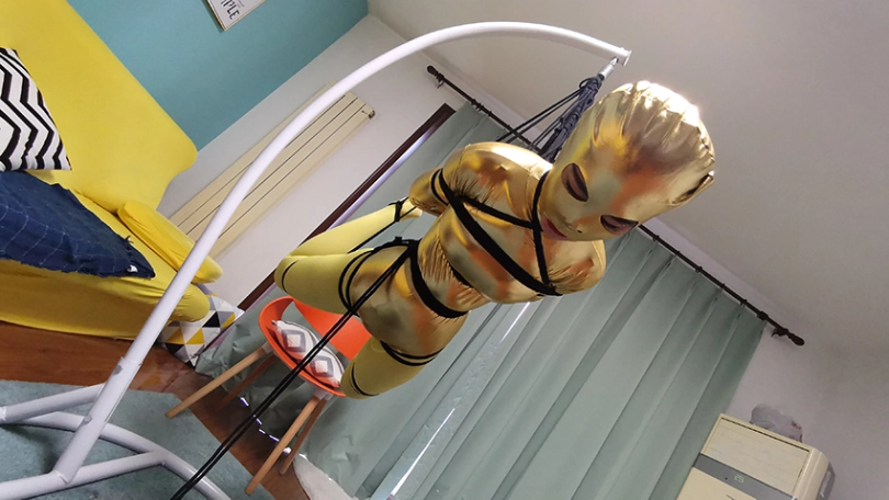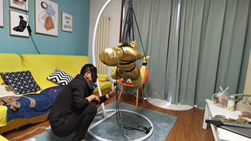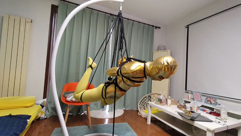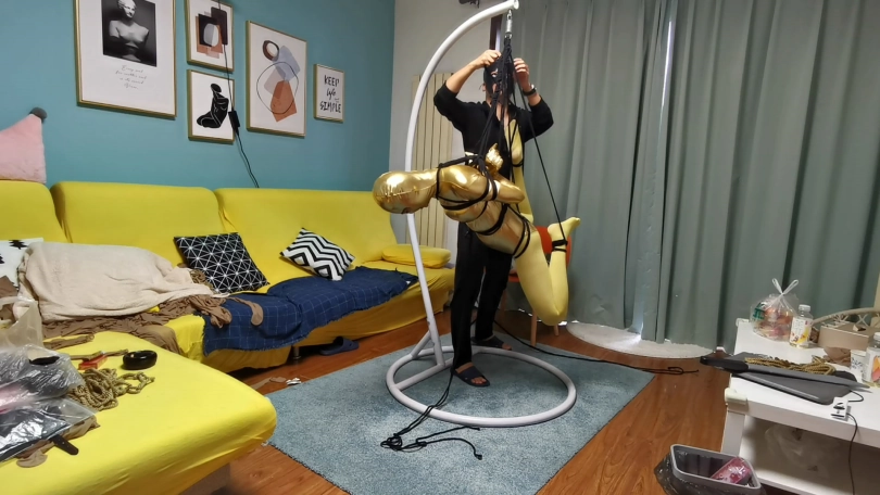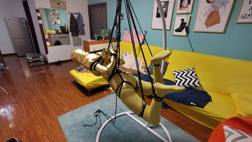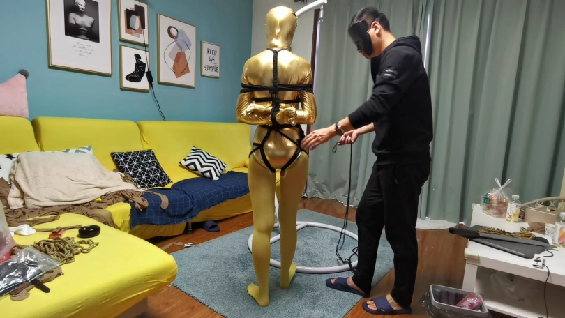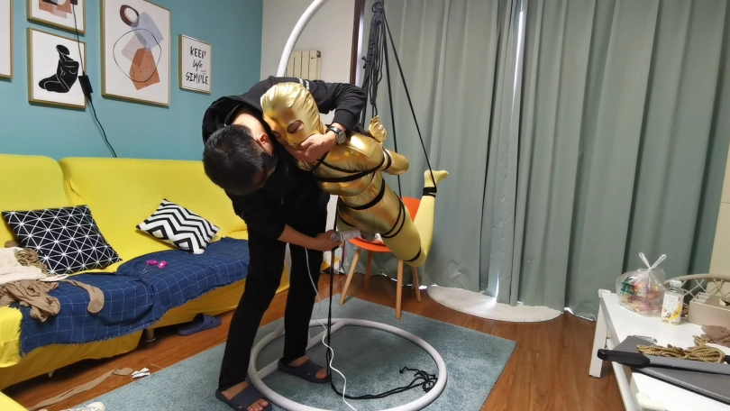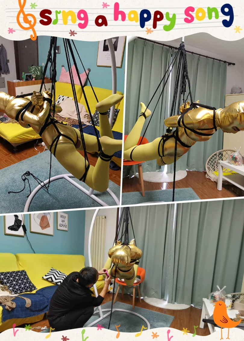 穿上黄色胶衣 连裤袜,第一次尝试悬吊妹子很紧张,一直大叫,太吵了,得让她安静下,不敢堵嘴怕她呼吸困难。想了个办法,塞了个TD,妹子居然没见过这东西,但有不好的感觉问:“这什么,什么呀?不要,不要,啊 啊 啊,嗯哼,嗯 嗯。。。”总算不吵了。
