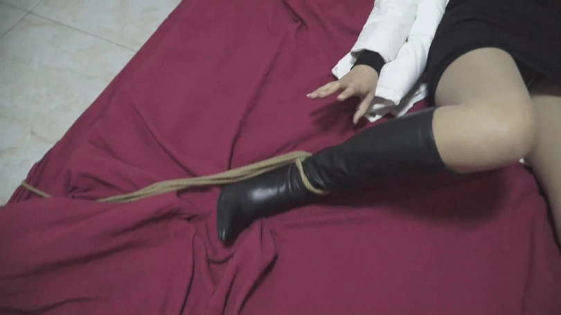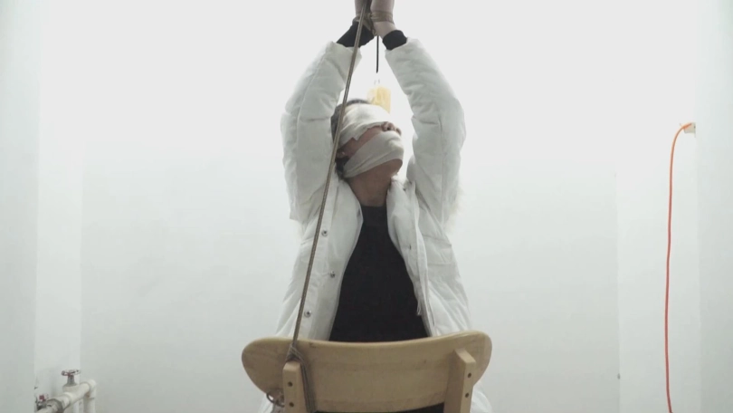 天亮了,屌丝男把美女绑成了坐缚,腿也绑在了椅子腿上,用刷子刷美女身上,说弄干净给她转移,美女还是不