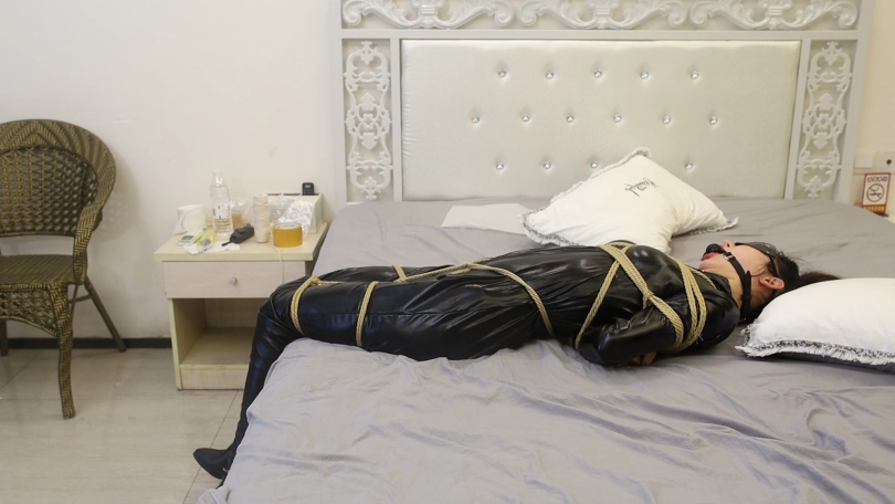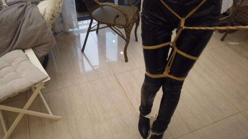 M趁机将雅雅扔在床上绑成了后高手缚,股绳,大腿和膝盖也捆绑的紧紧的,脚踝上又加上了一副金属脚镣,链子只有20厘米。在这重重的紧缚之下,雅雅只能任其处置了。