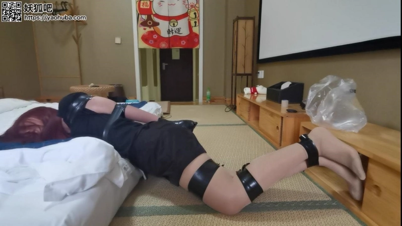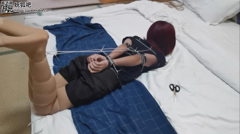 挑战内容:扎带捆绑手腕手臂。用胶带将挑战者的手臂与身体綁緊。用扎带分别捆绑模特的大腿,膝盖上下,脚踝捆緊。随后在扎带捆绑处綁两圈胶带。以驷马捆绑结尾。驷马要求拉至极限位置。挑战者需要在10分钟内用剪刀解开身上所有捆绑材料。超过10分钟,算挑战失败。